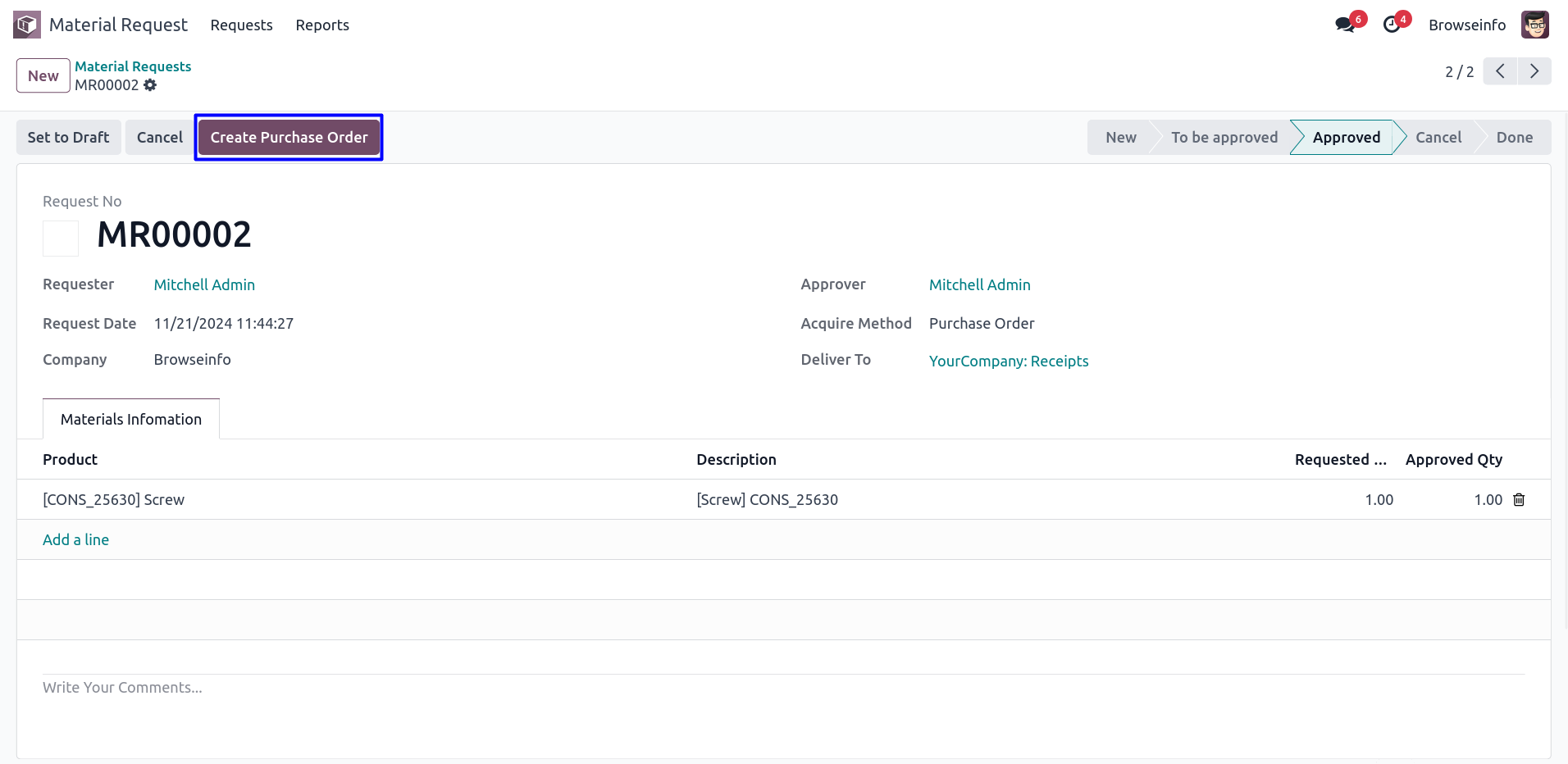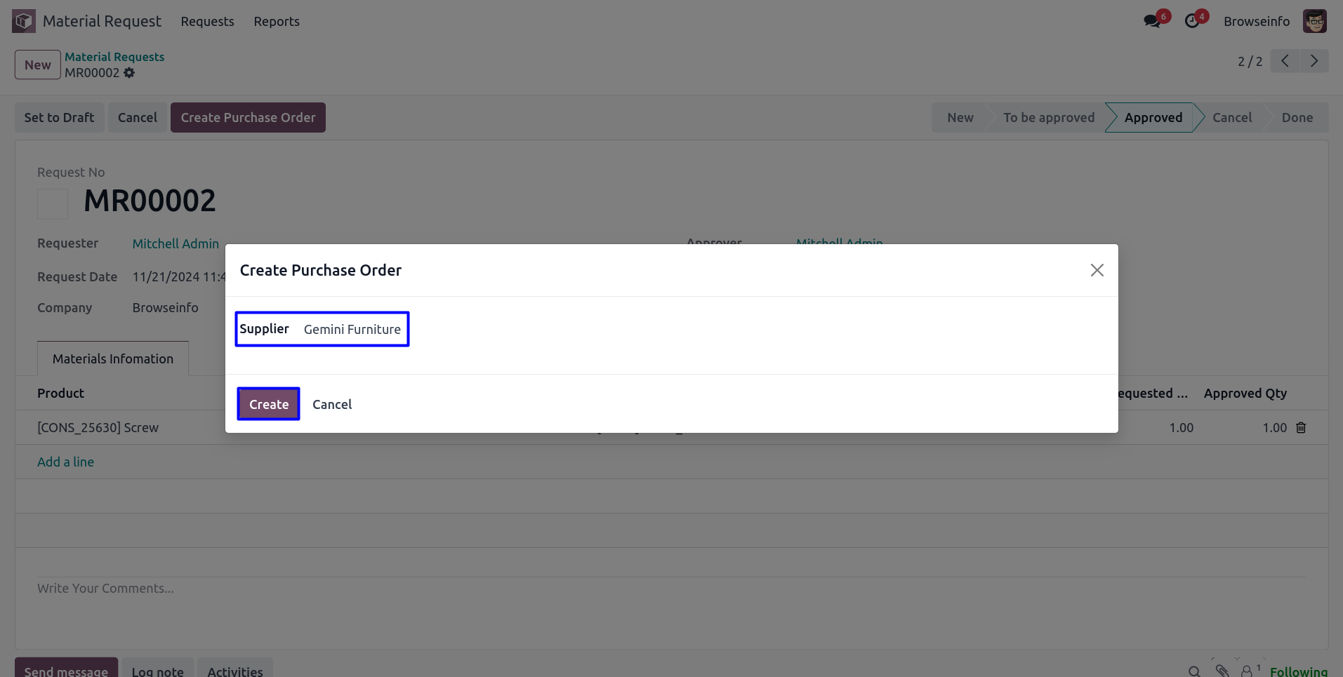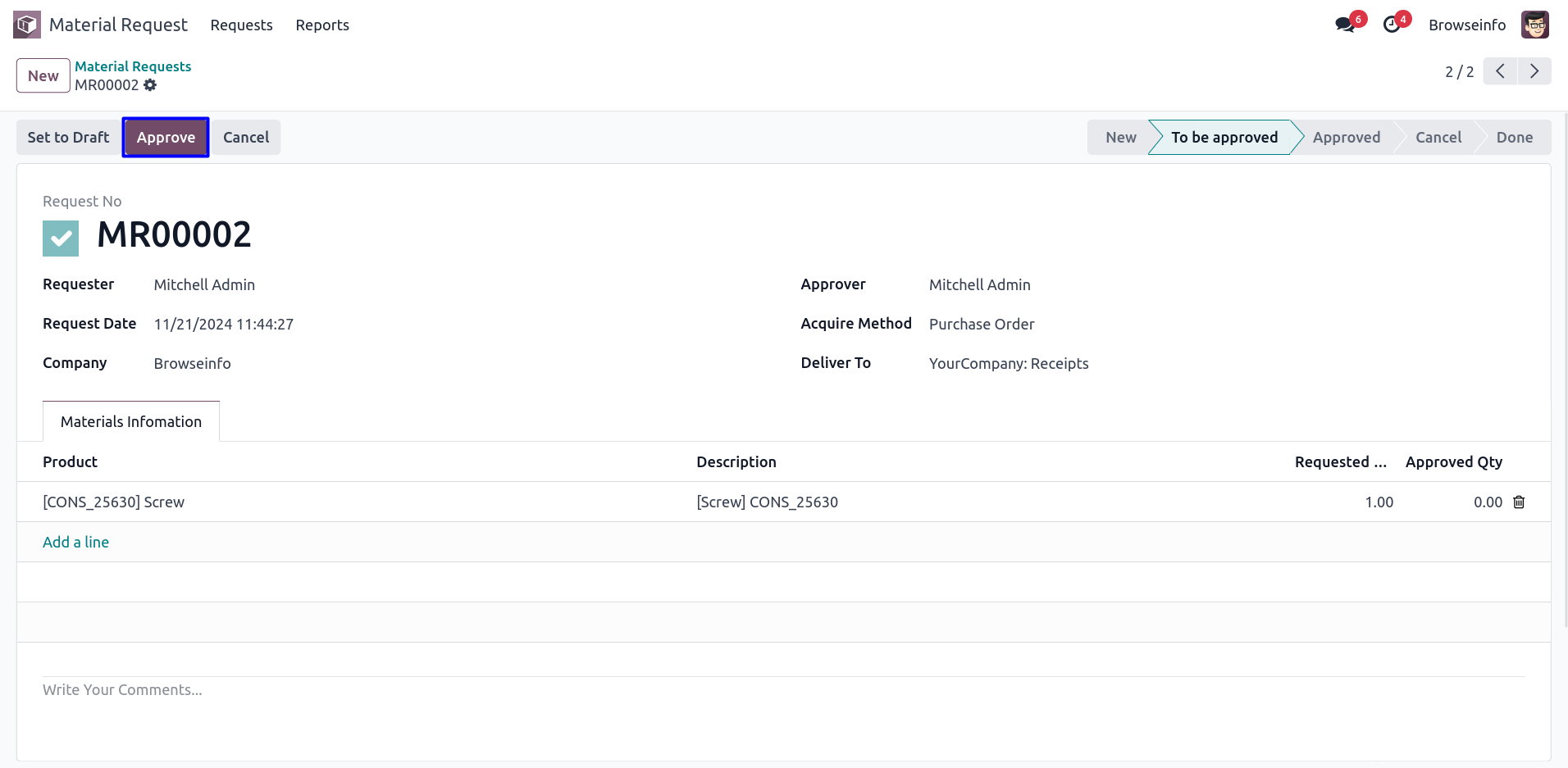 A form will be displayed, where approver can approve or cancel that particular material request. Also approver needs to mention quantity of the products that should be provided.
