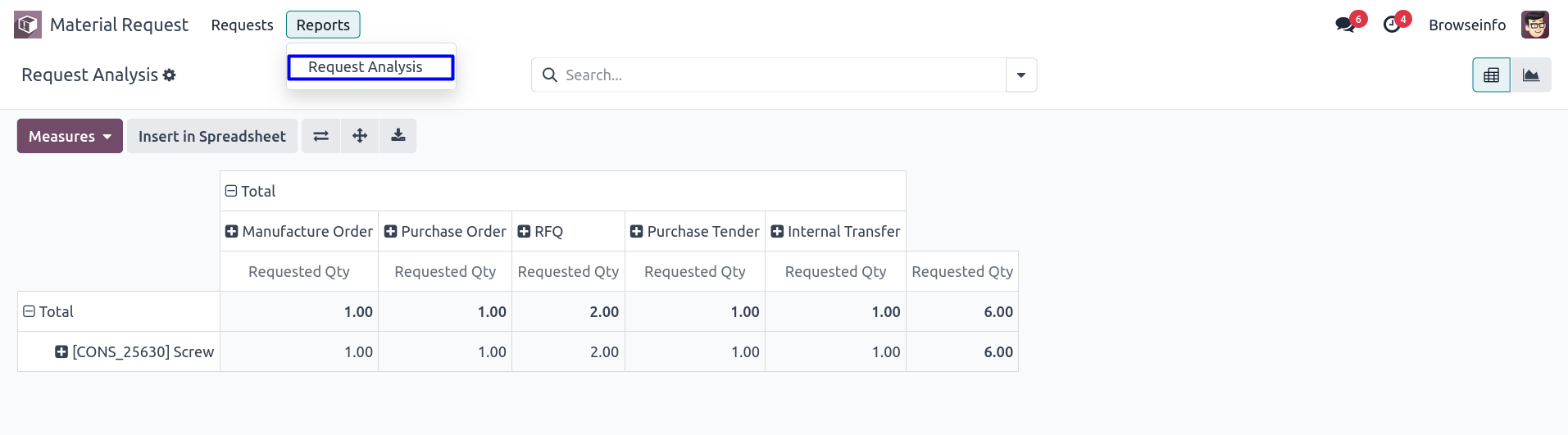 We can see well designed Analysis report for request. Both Requester and Approver can see reports of requests that are made, also requests that has been approved. There are few more filters provided in the reports. Like, acquired method i.e RFQ/Tender/Purchase Order/Internal Transfer/Manufacture Order, approver, product, request date etc. With these features in Reports, One can find every details of any request has been made.