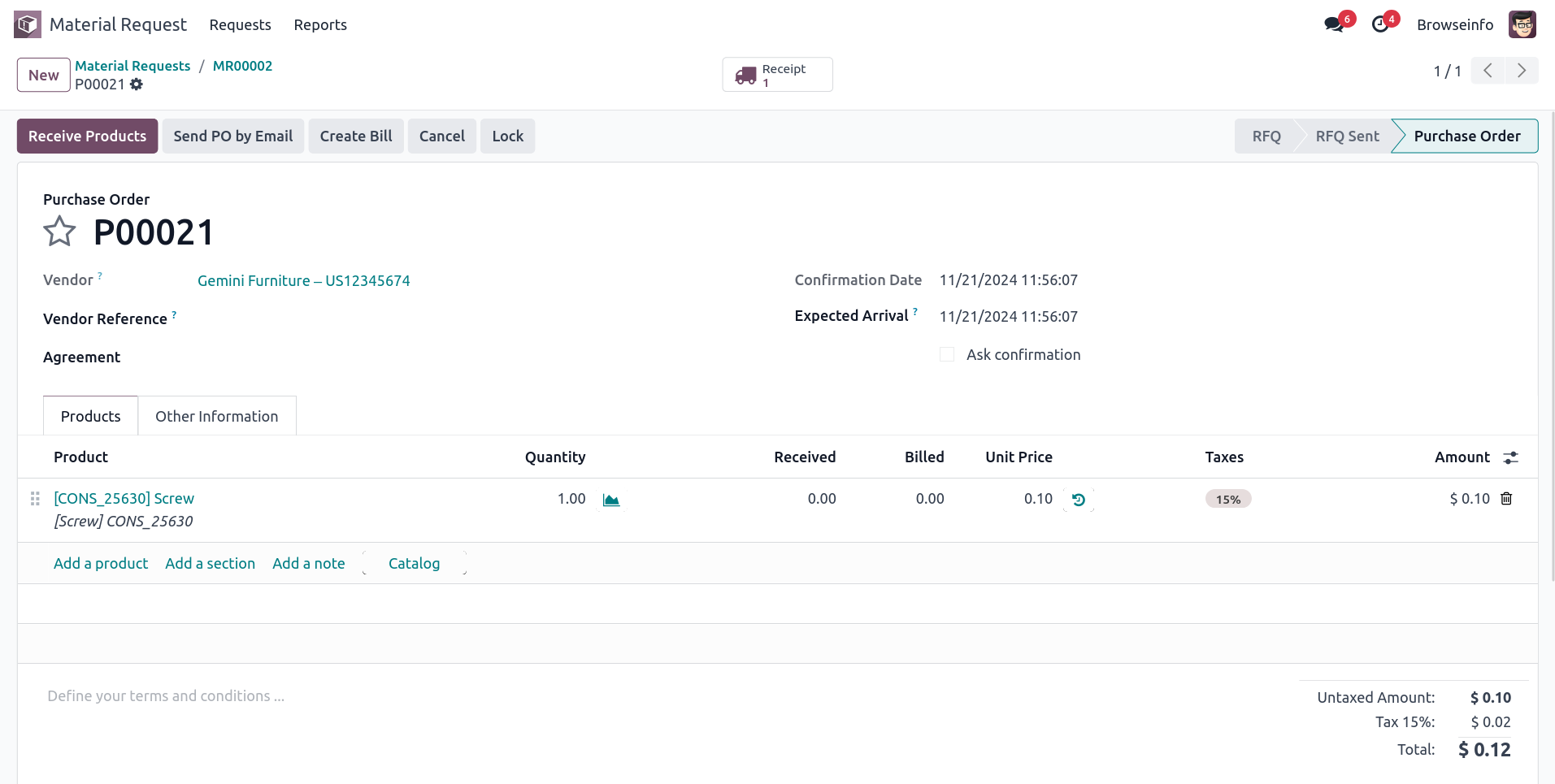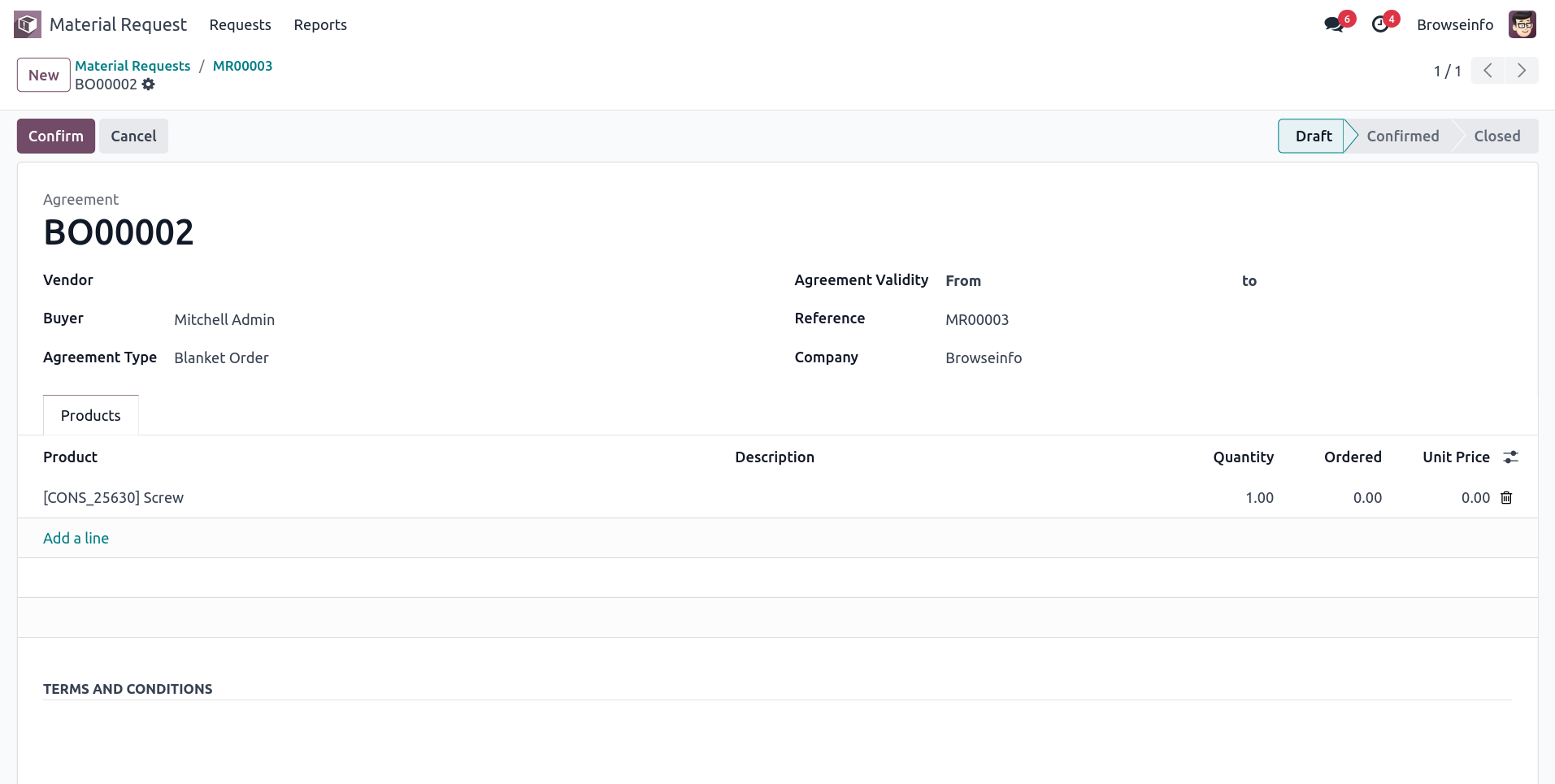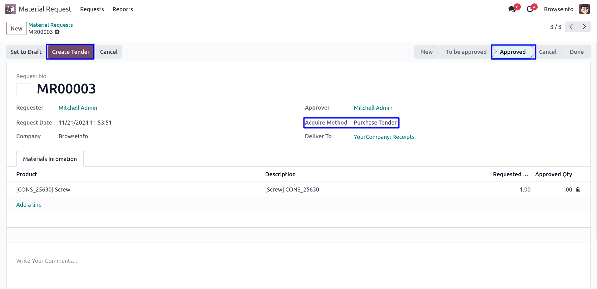 Using this odoo apps Material Requisitions and Request can be done for RFQ-Request for Quotation,Purchase Tender, Manufacturing Order, or Picking for production. Once request/Requisitions for any material is placed, approver can see that request and approve or cancel it. Also Approver can define quantity of material that should be delivered along with who should be supplying those materials.
