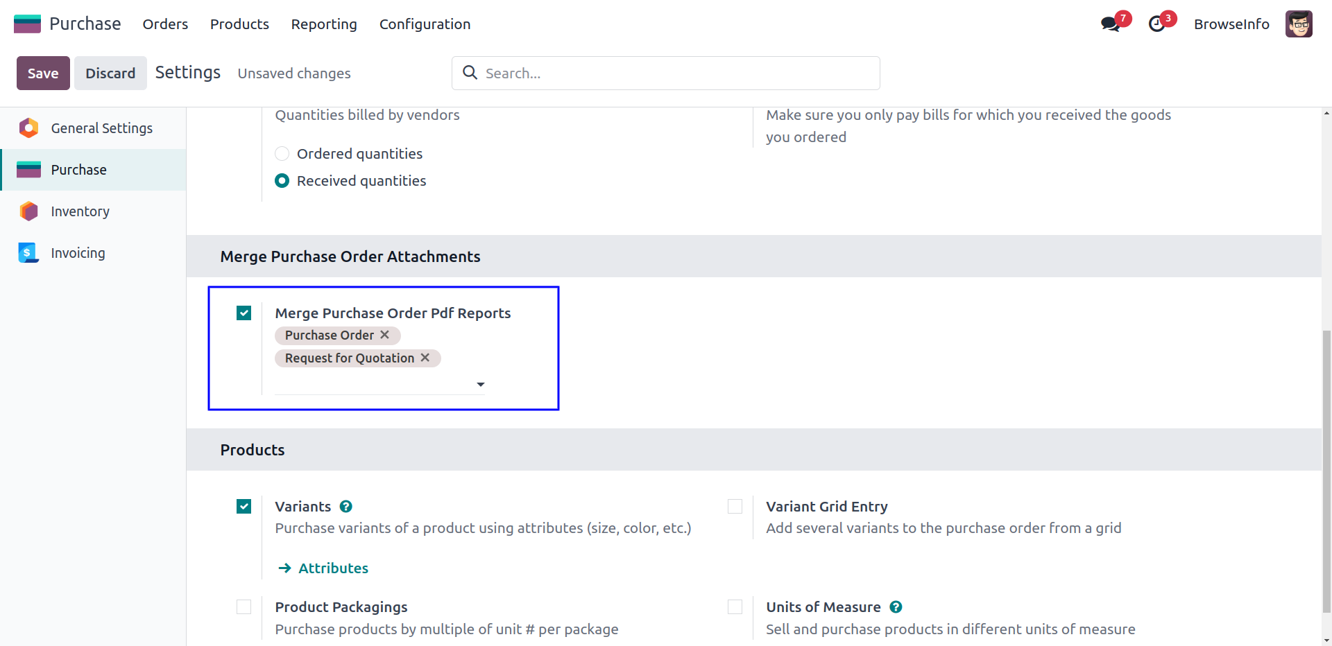User can easily enable or disable merge purchase order PDF reports from purchase configuration.