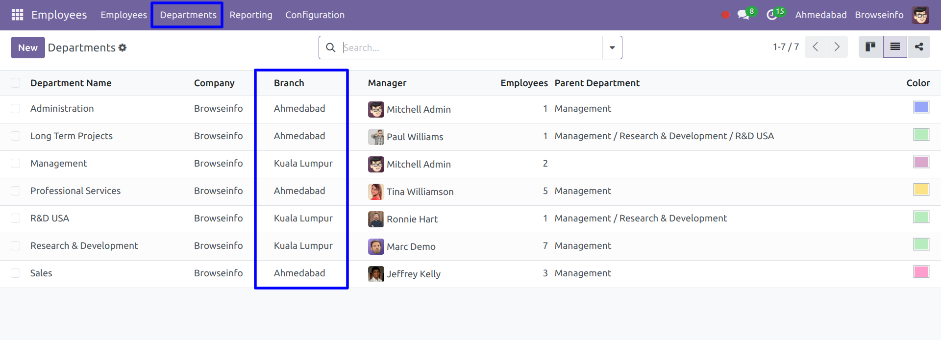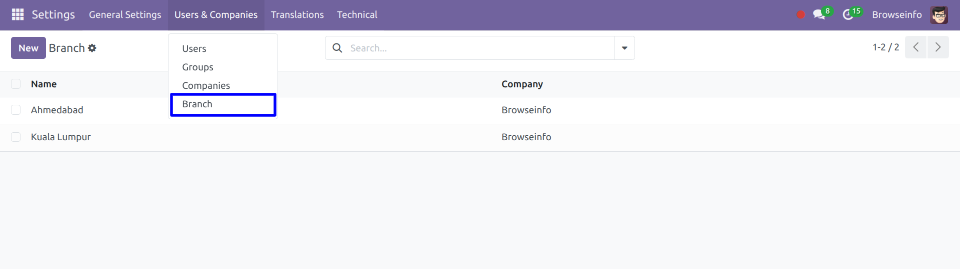 Branch Manager can create multiple branch under Settings > Users & Companies > Branch menu, Branch manager also can set branch details like address, phone, company.