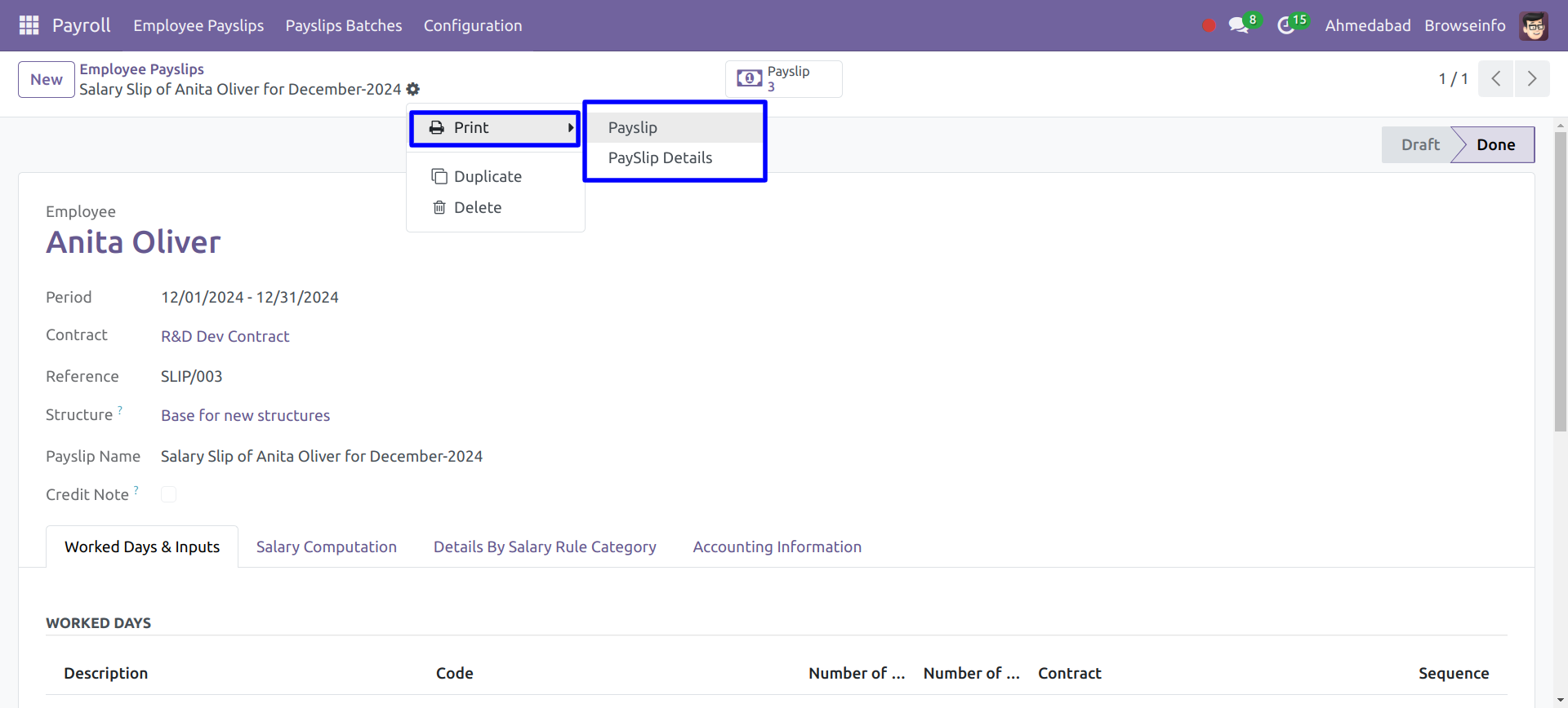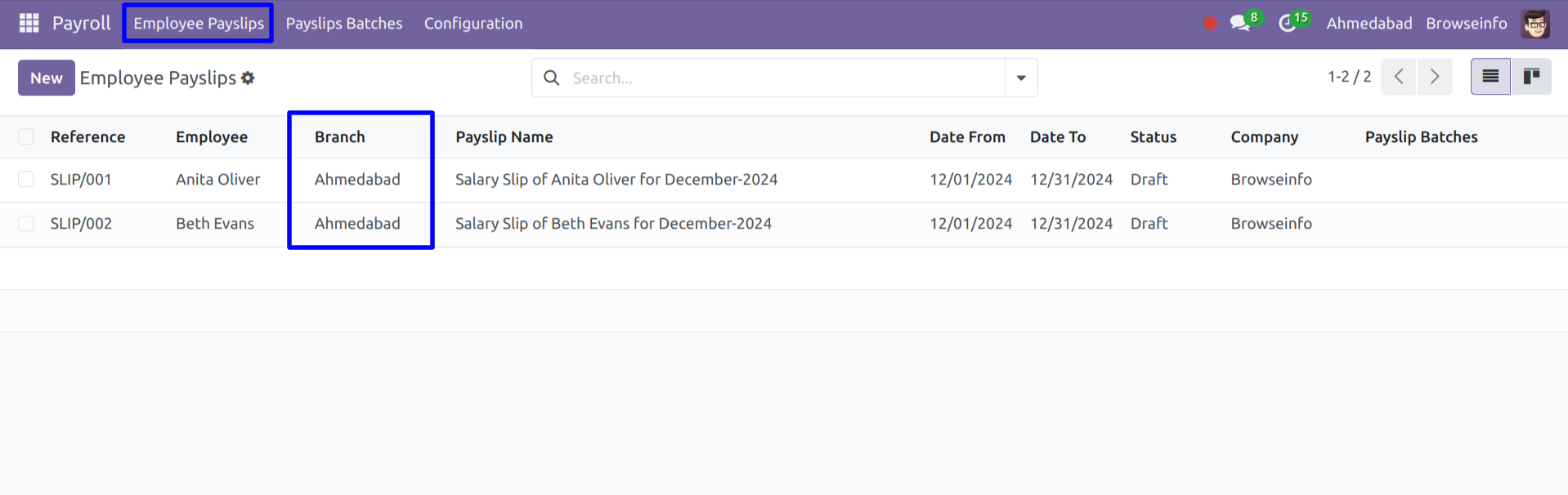 User can also generate payslip in community edition, User can compute sheet and confirm payslip. On creating payslip user can see selected employees branch will automatically selected and see on tree view.