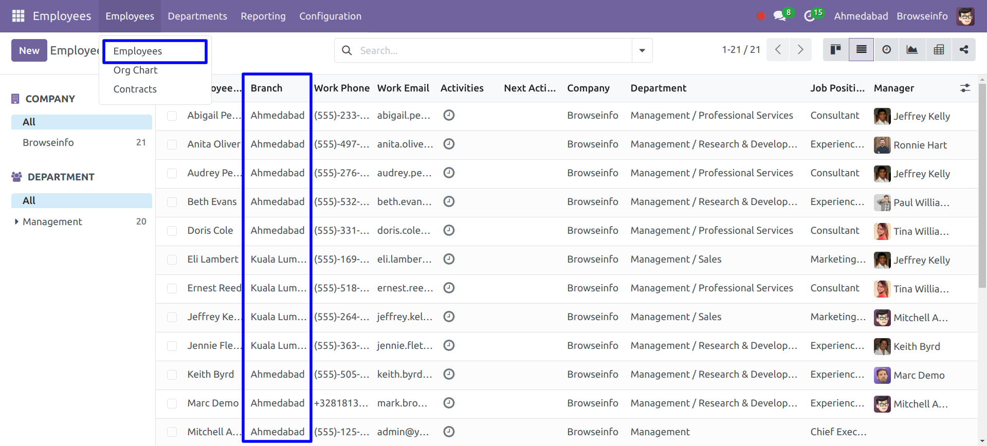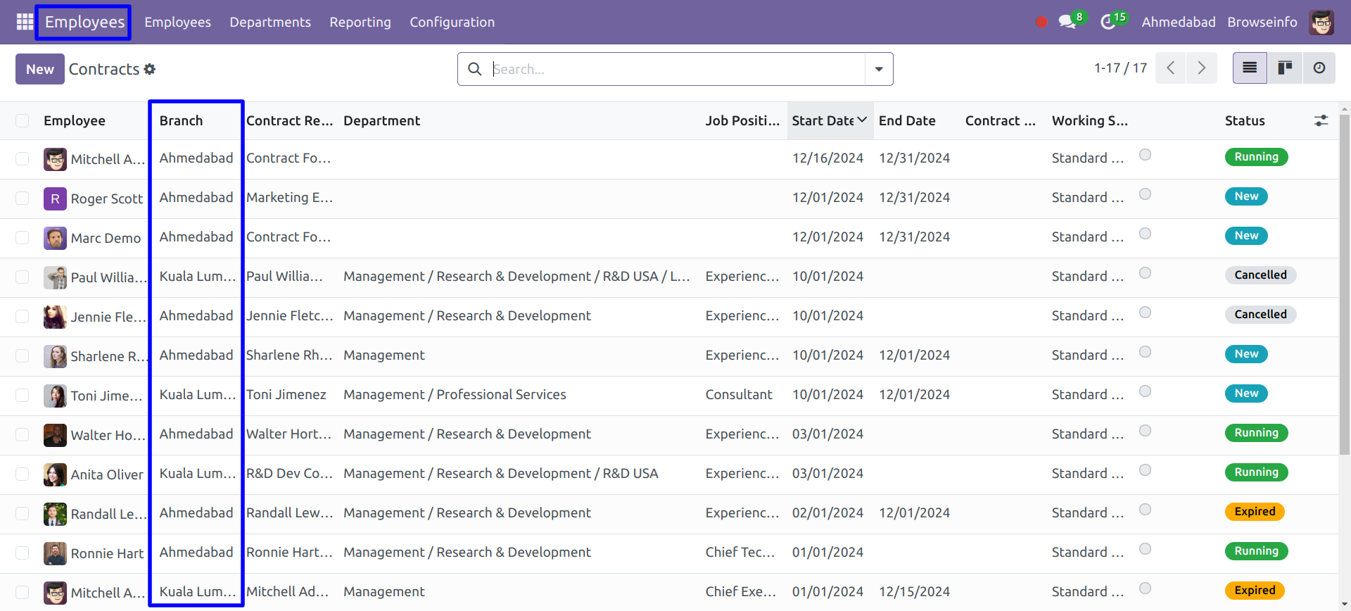 On selecting employee on contract selected employees branch will automatically set to contract, user can see branch on employee contract tree view.