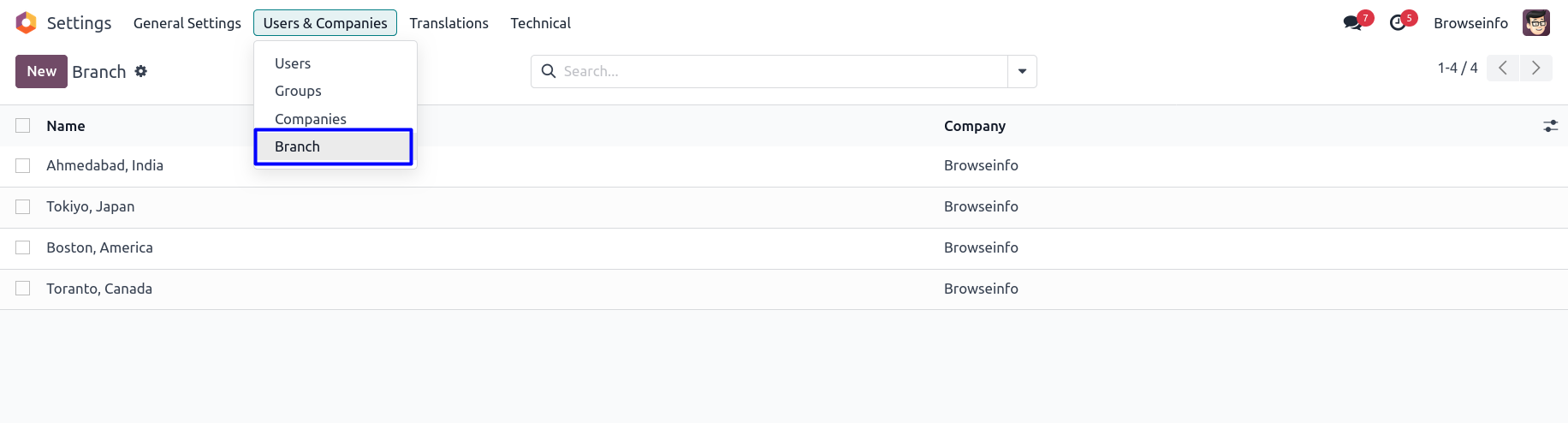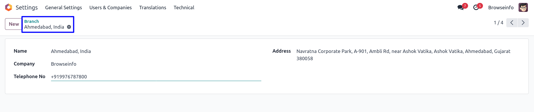 Branch Manager can create multiple branch under Settings > Users & Companies > Branch menu, User also can set branch details like address, phone, company.