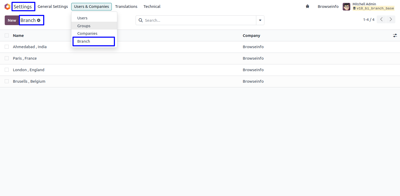 Branch Manager can create multiple branch under Settings > Users & Companies > Branch menu, Branch manager also can set branch details like address, phone, company.