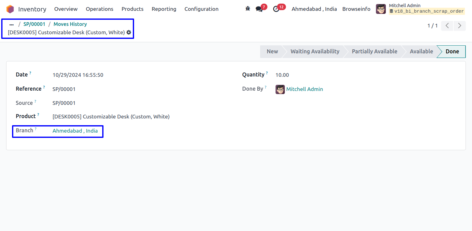 User can see selected branch on scrap order will also pass to created product moves for that.