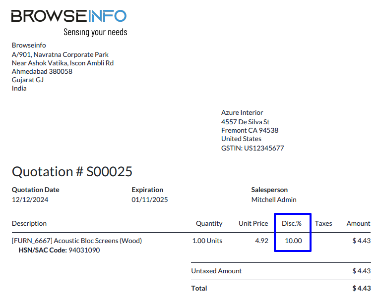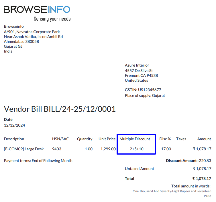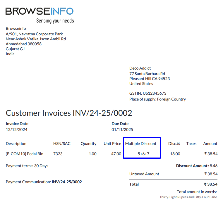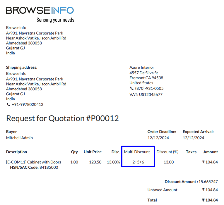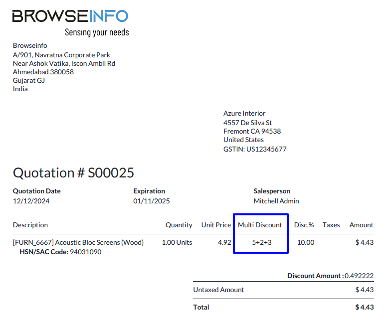 Mixed Multi Discount in Sales, Purchases, Invoices, and Bills The Odoo App improves the process of applying multiple discounts across various transactions such as sale orders, purchase orders, customer invoices, and vendor bills. Users can add multiple discounts, and this odoo app will automatically calculate the total discount. For higher flexibility, users can enable or disable the multi discount report print option, modifying the visibility of multiple discounts in sales, purchase, invoice, and bill reports. Multiple discounts are easily differentiated using the '+' sign, allowing for precise calculations that contribute to a more efficient and customizable discount management system.