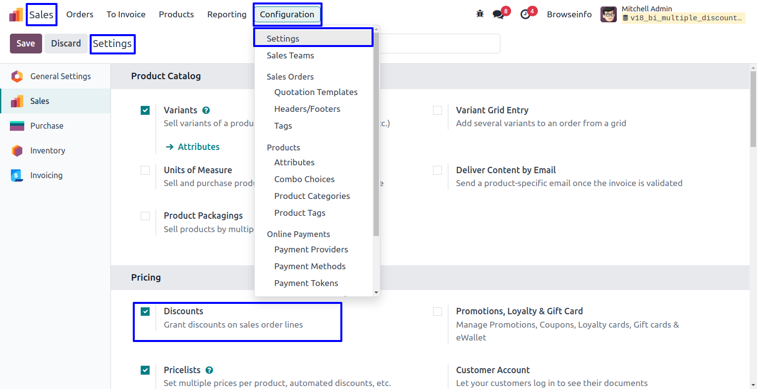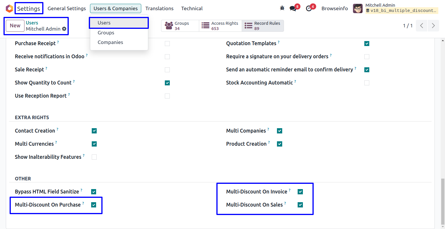 User can enable or disable multi discount on sales, purchase and invoice option.
