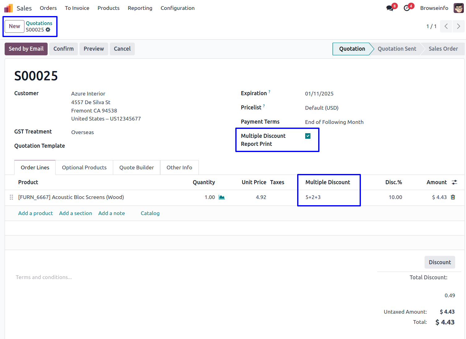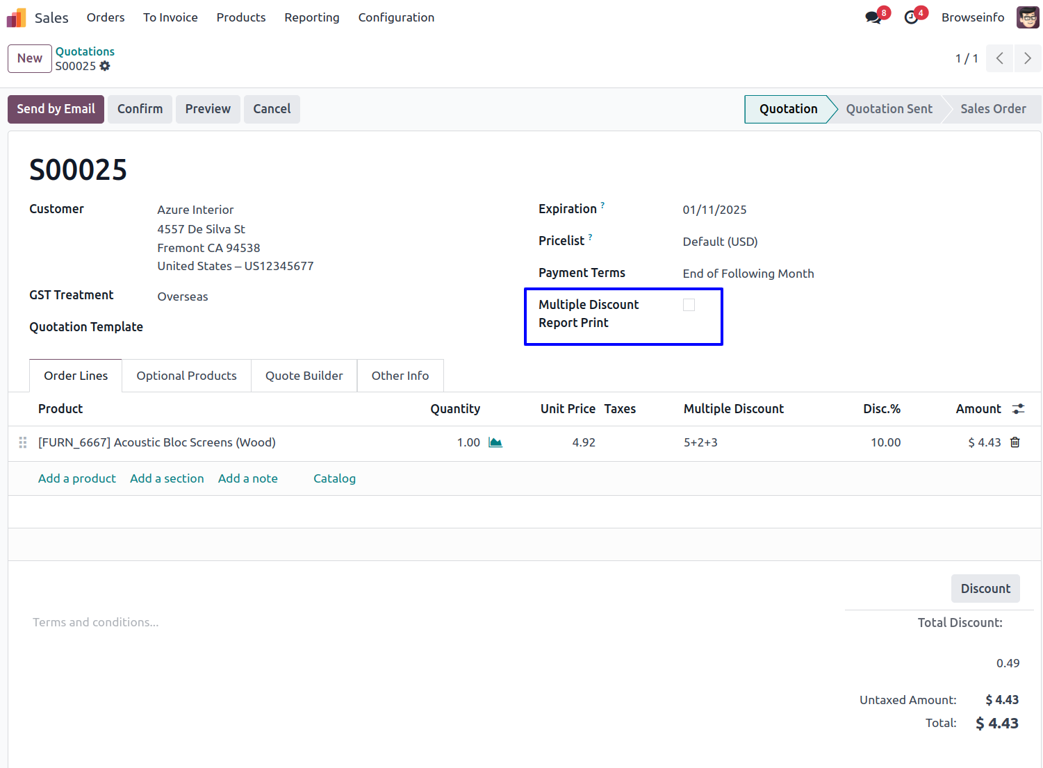 User can disable "Multiple Discount Report Print" checkbox to print without multiple discount on sale order report.
