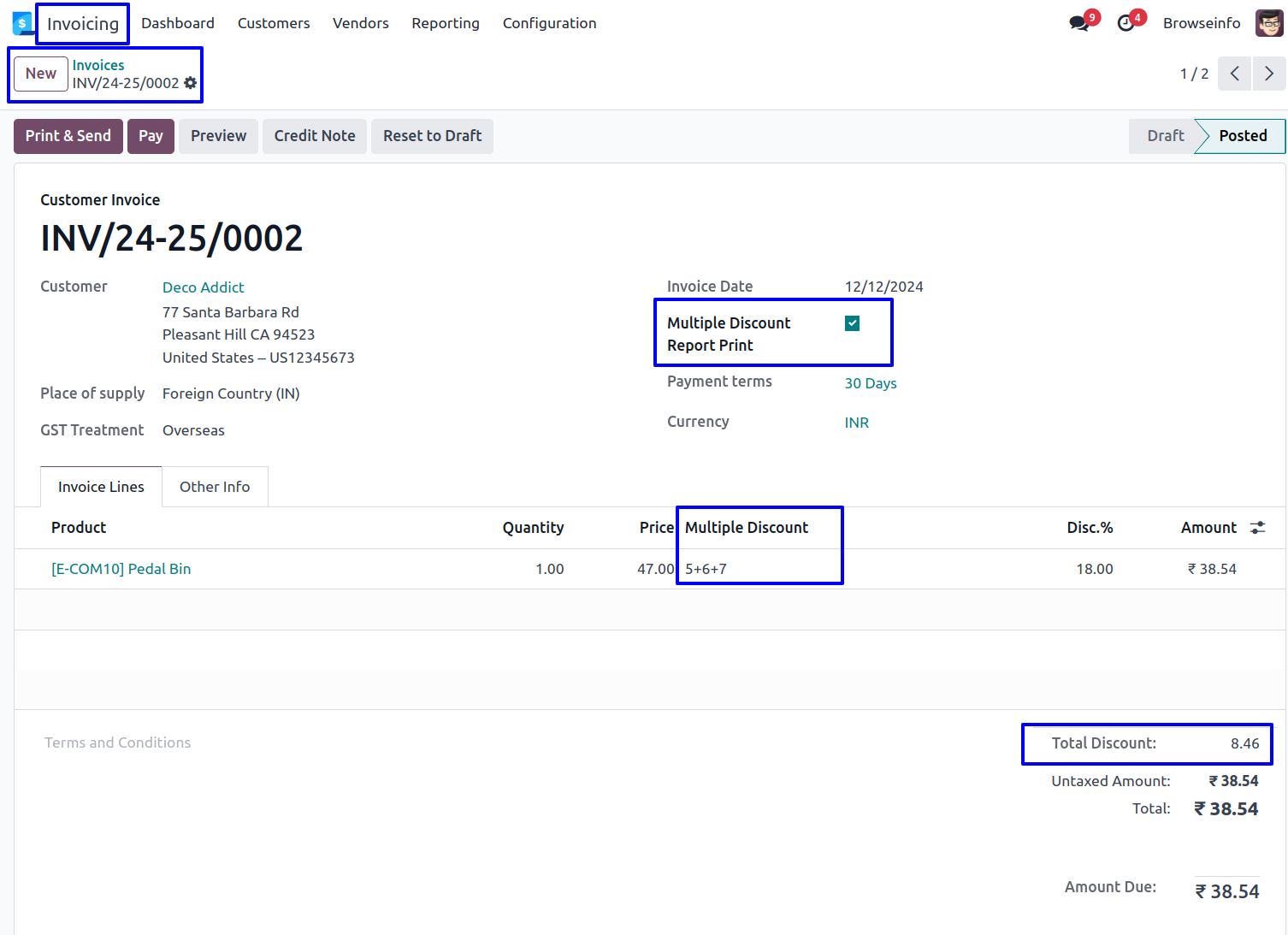 User can enable "Multiple Discount Report Print" checkbox to print multiple discount on customer invoice report.