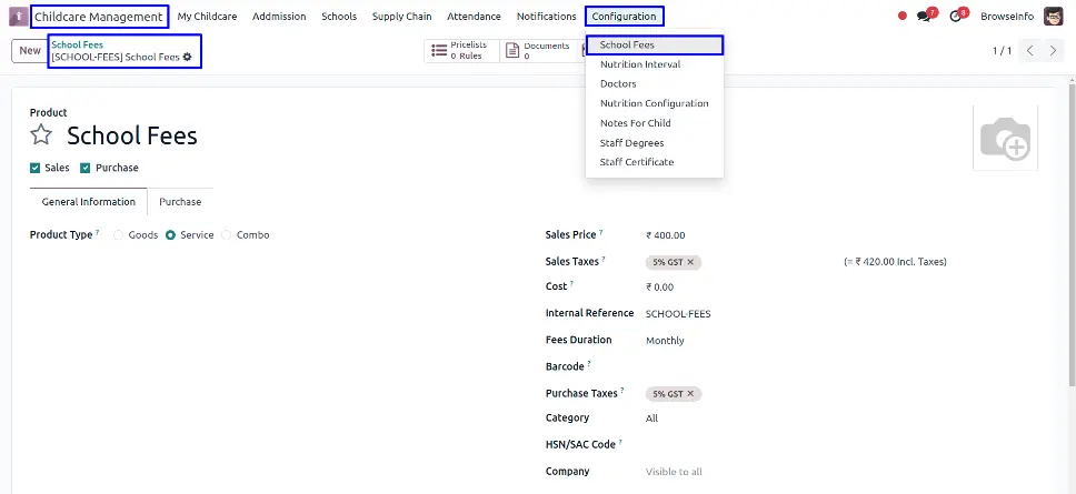 Under Childcare Management > Configuration > School Fees menu users can create school fees.