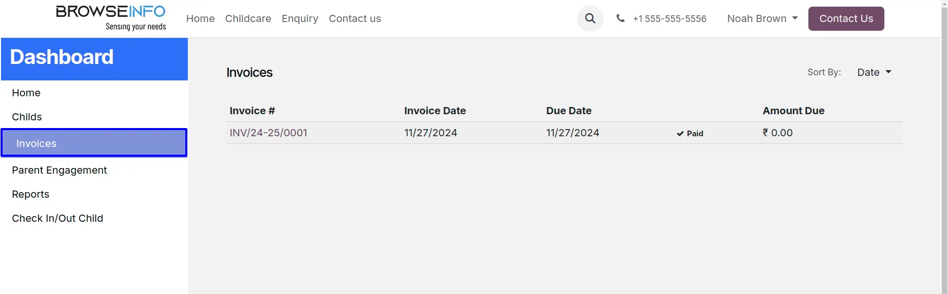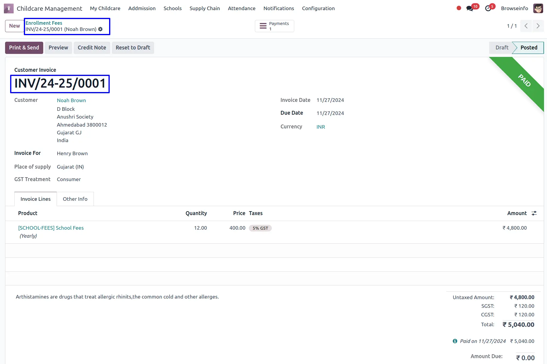 Under Childcare Management > Admission > Invoices menu users can create invoices for child fees.