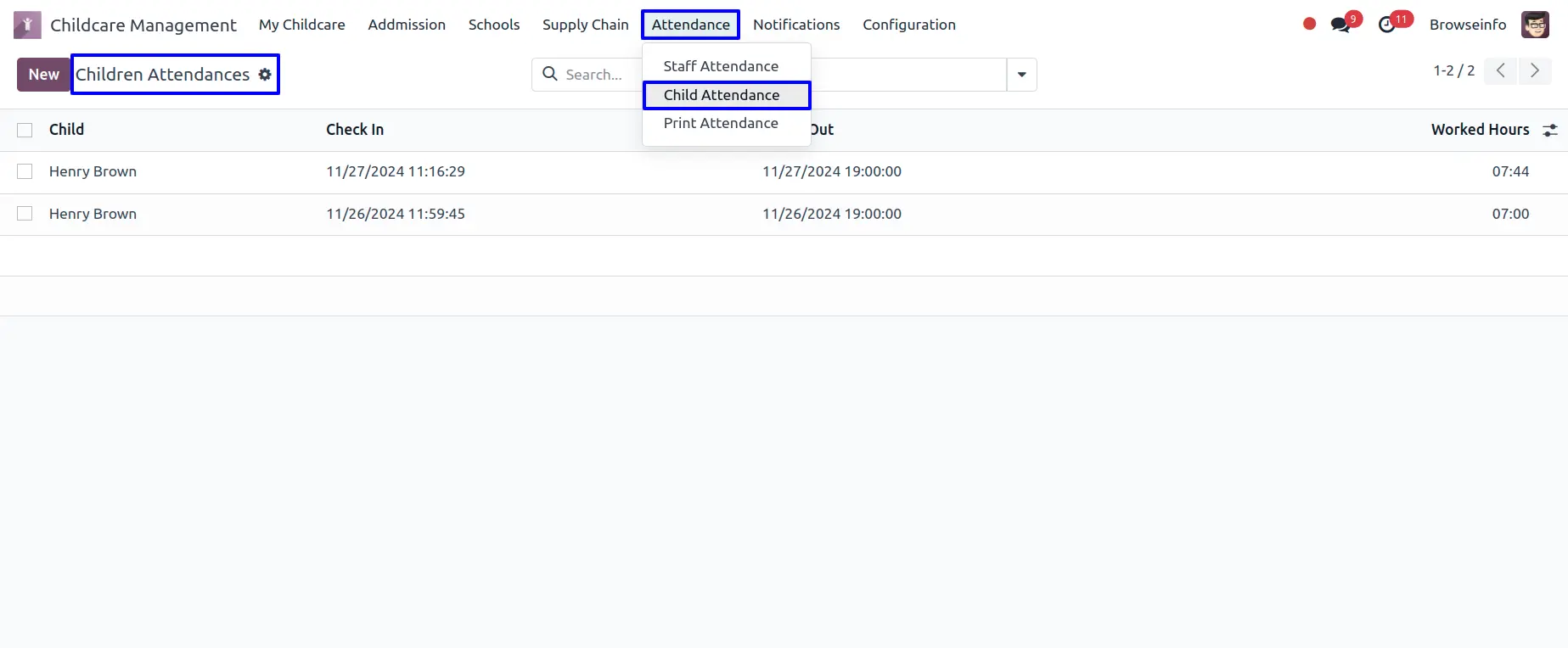 Under Childcare Management > Attendance > Child Attendance menu users can see child attendance.