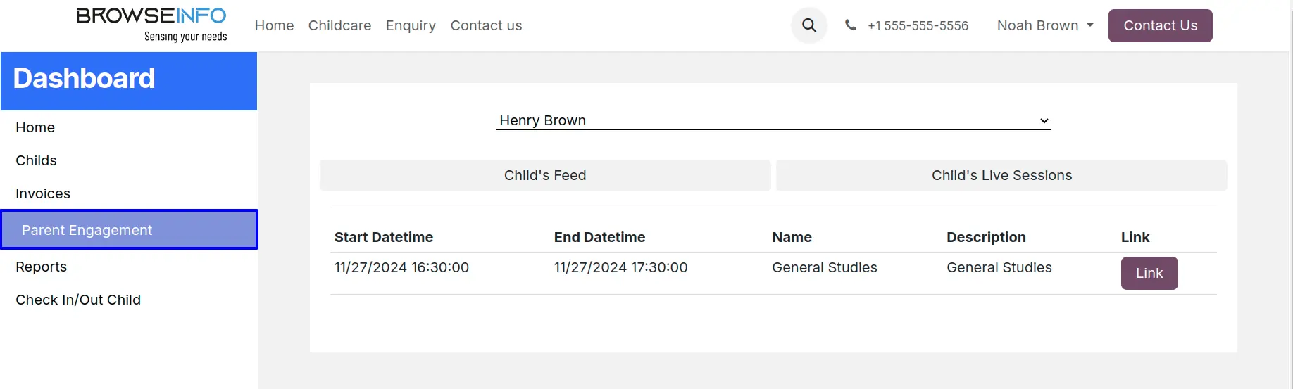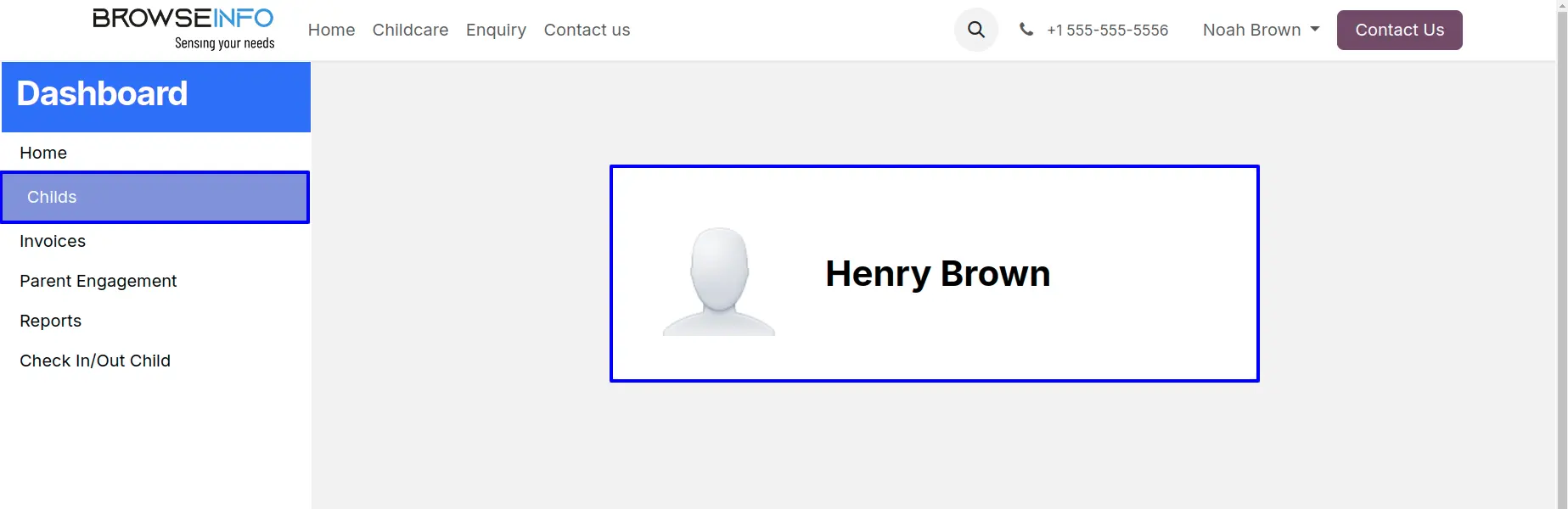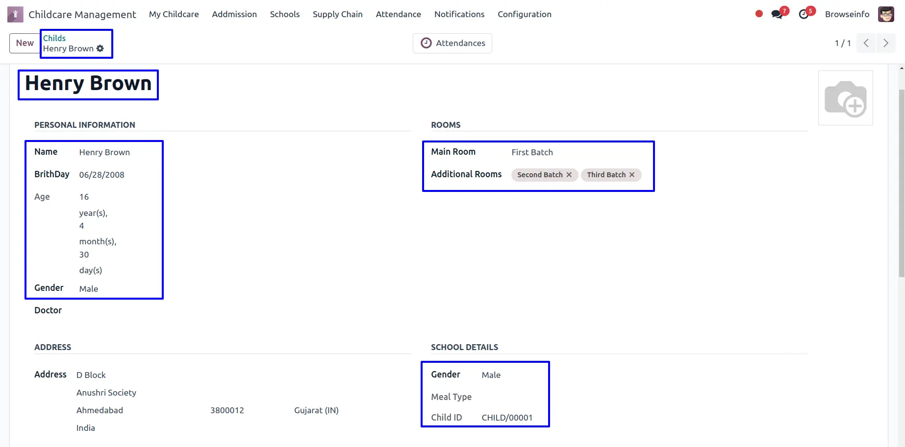 Under Childcare Management > My Childcare > Childs menu users can see created children, and add school details for children.