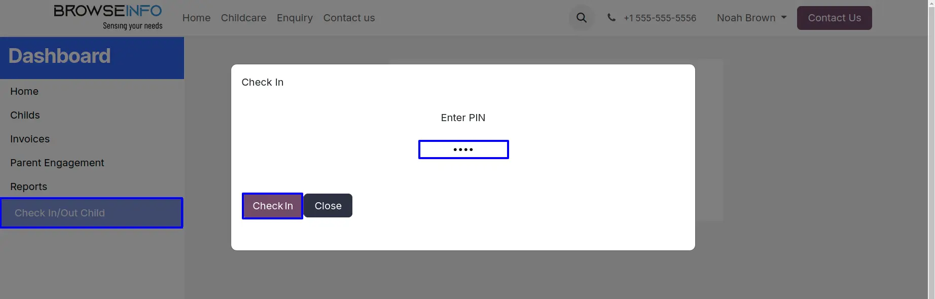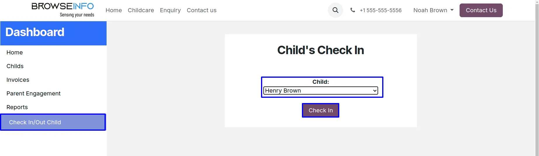 Users can check in for a child by selecting a child and clicking the "Check In" button.