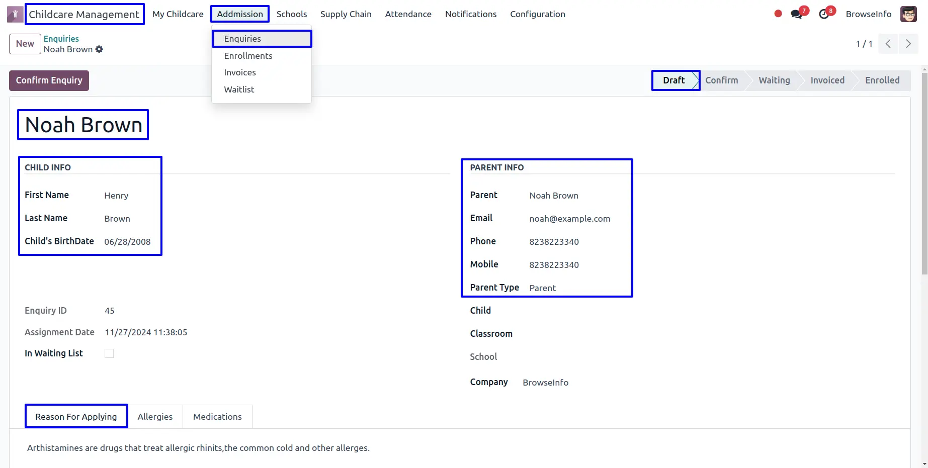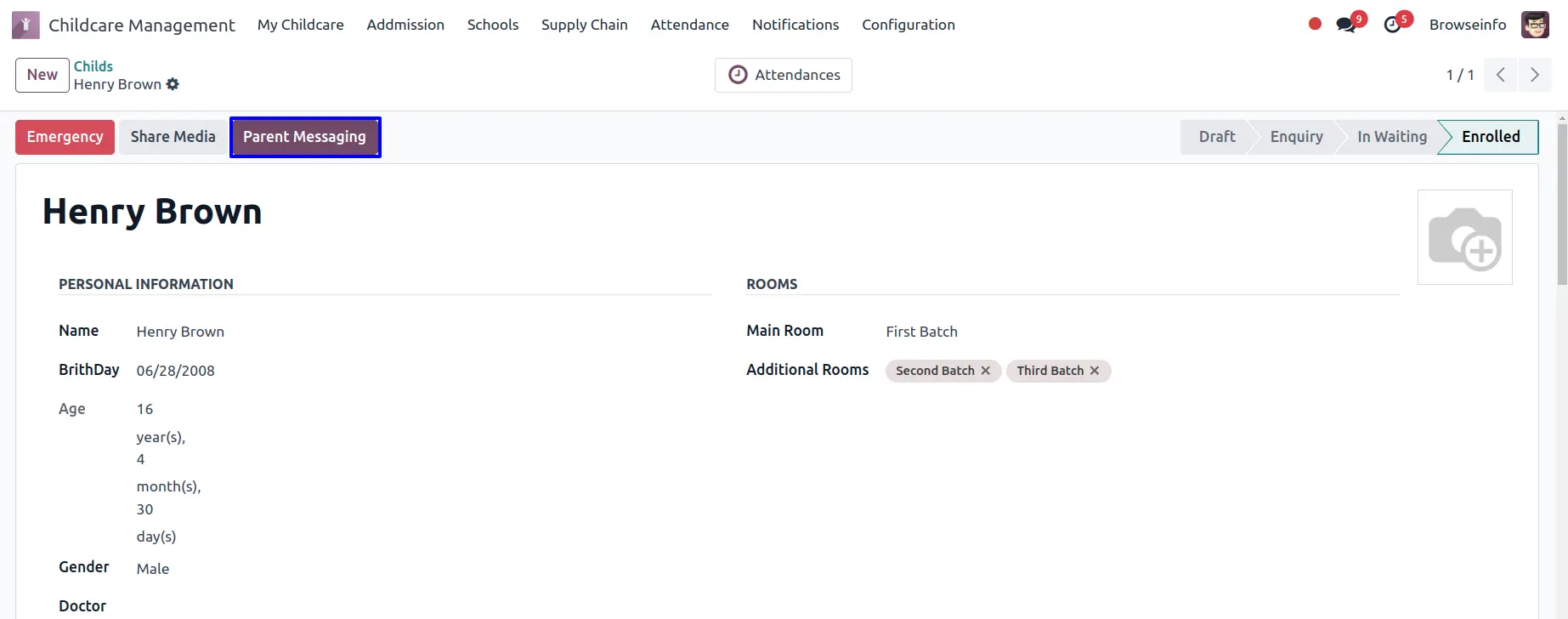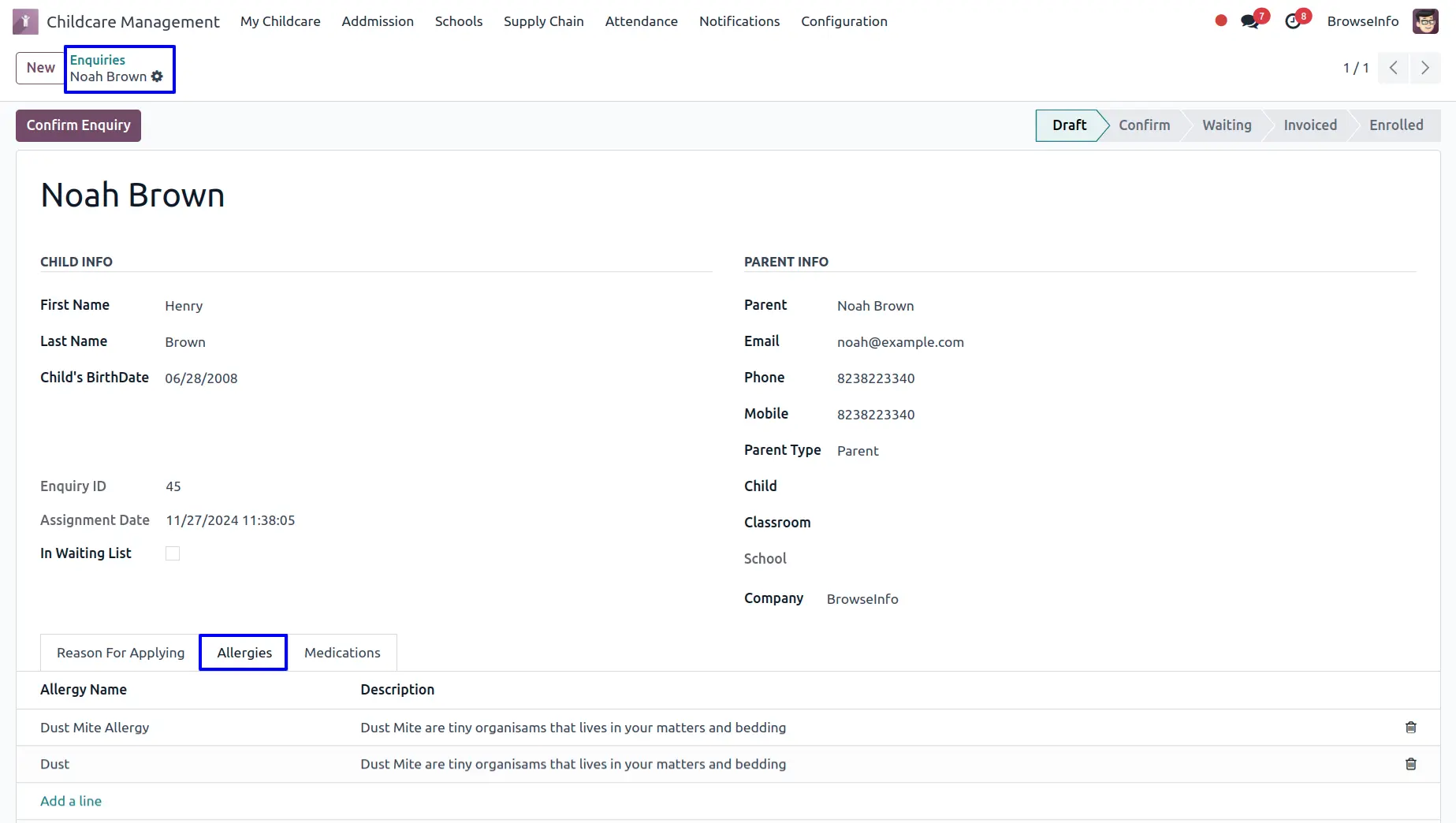 When the child enrolment process is done, parents are created from inquiry. You can also assign a classroom of school to childs, create an invoice for school fees, add nutrition, allergy and medicine for childs. Users can also manage supply chain management for the nursery material requirements. Nursery staff can create supply requests, approve requests and create purchase orders for supply requests.