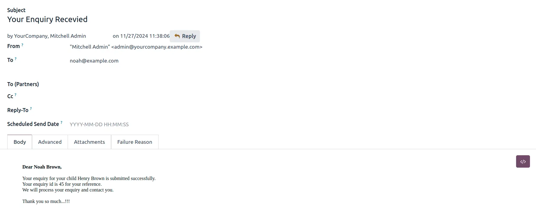 Receive admission inquery from portal user and confirm and enroll child, send enrollment details with login details by email.