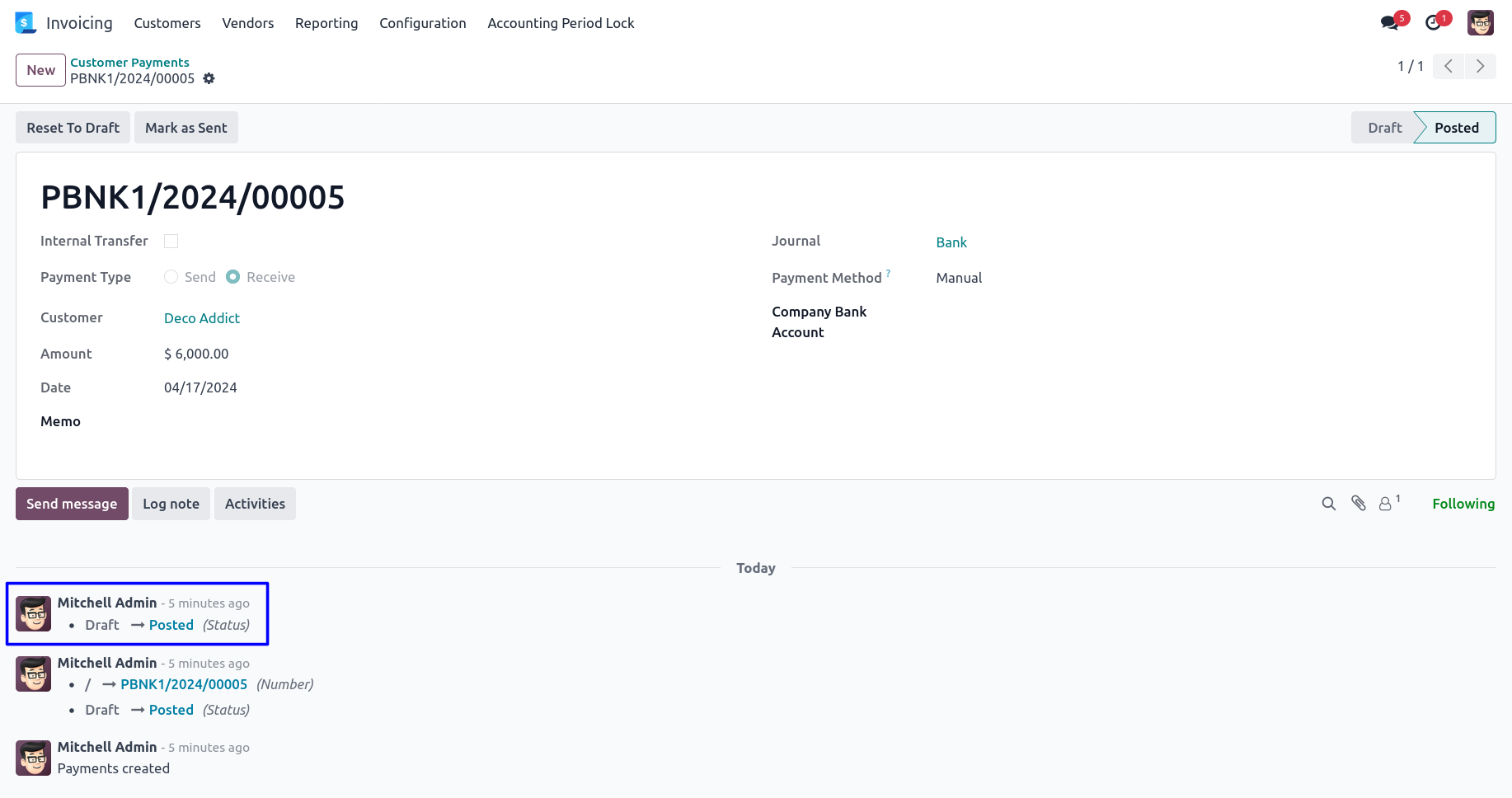 When account payment created new message will appeared in account payment chatter.