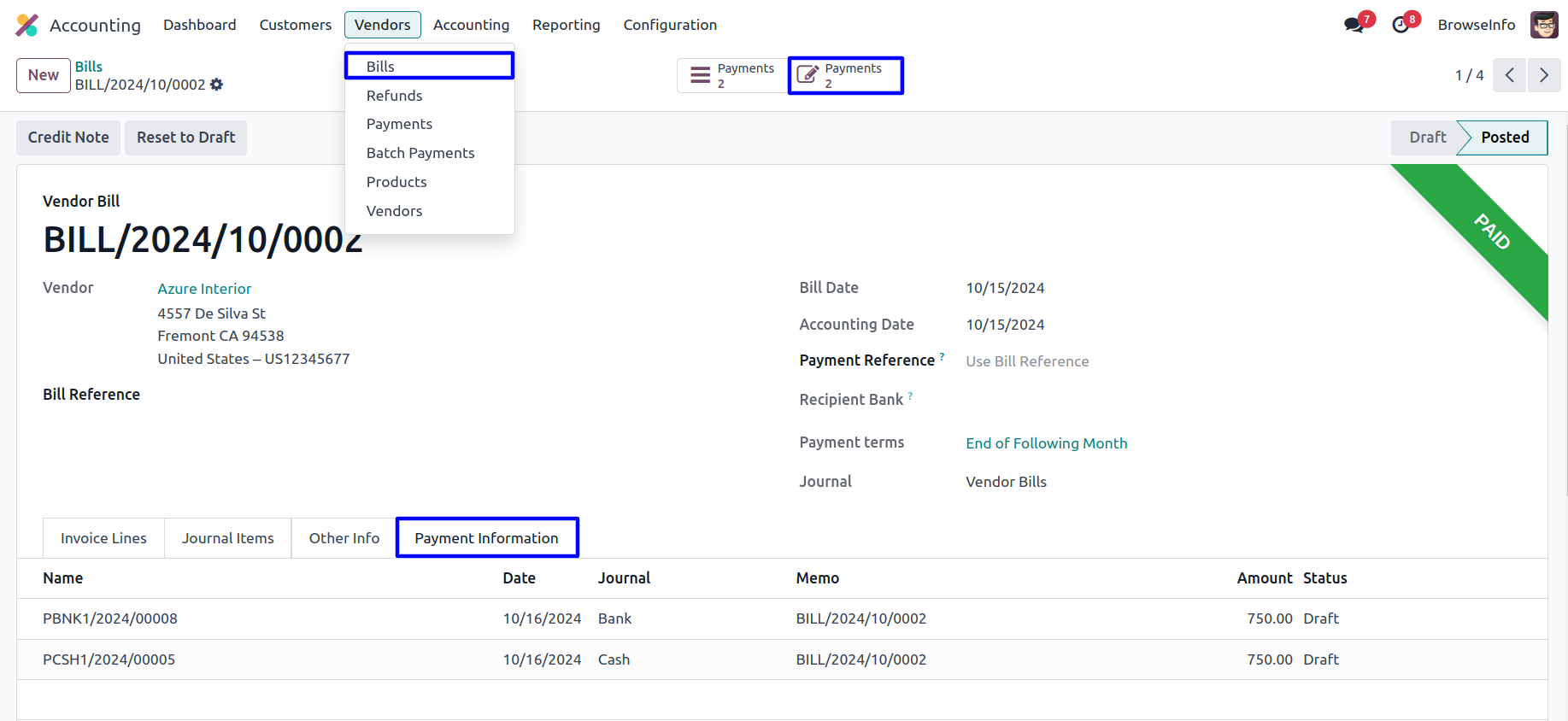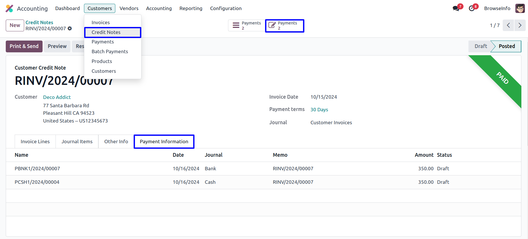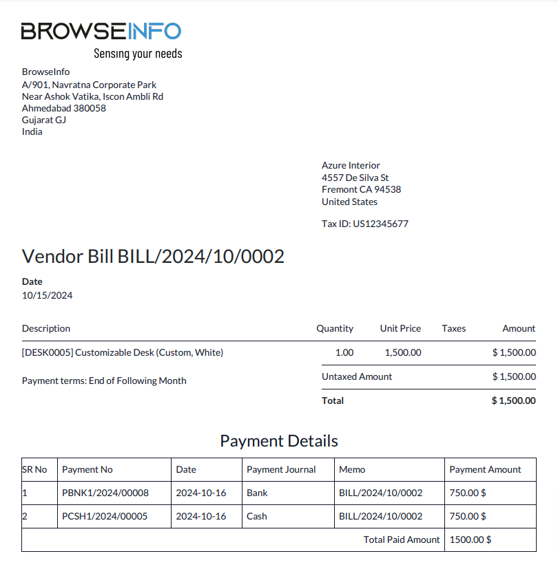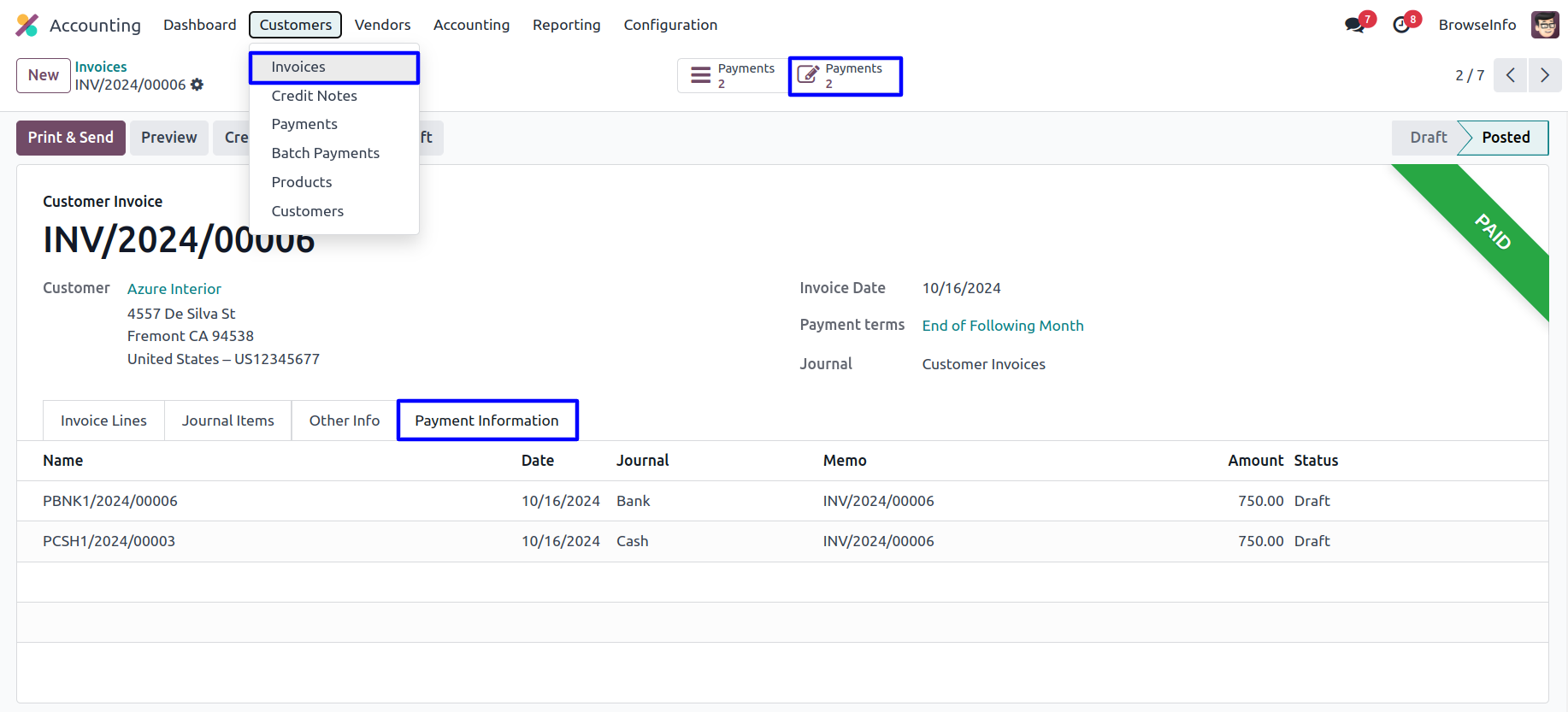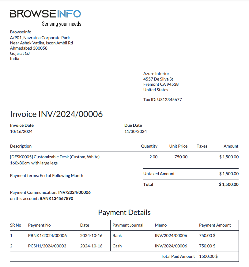 Print Payment information on Invoices/Bills odoo app helps users to see payment details of customer invoice, customer credit note, vendor bill and refund (vendor credit note). Users also can see payment details printed on pdf reports for customer invoice, customer credit note, vendor bill and refund (vendor credit note).