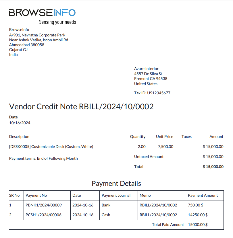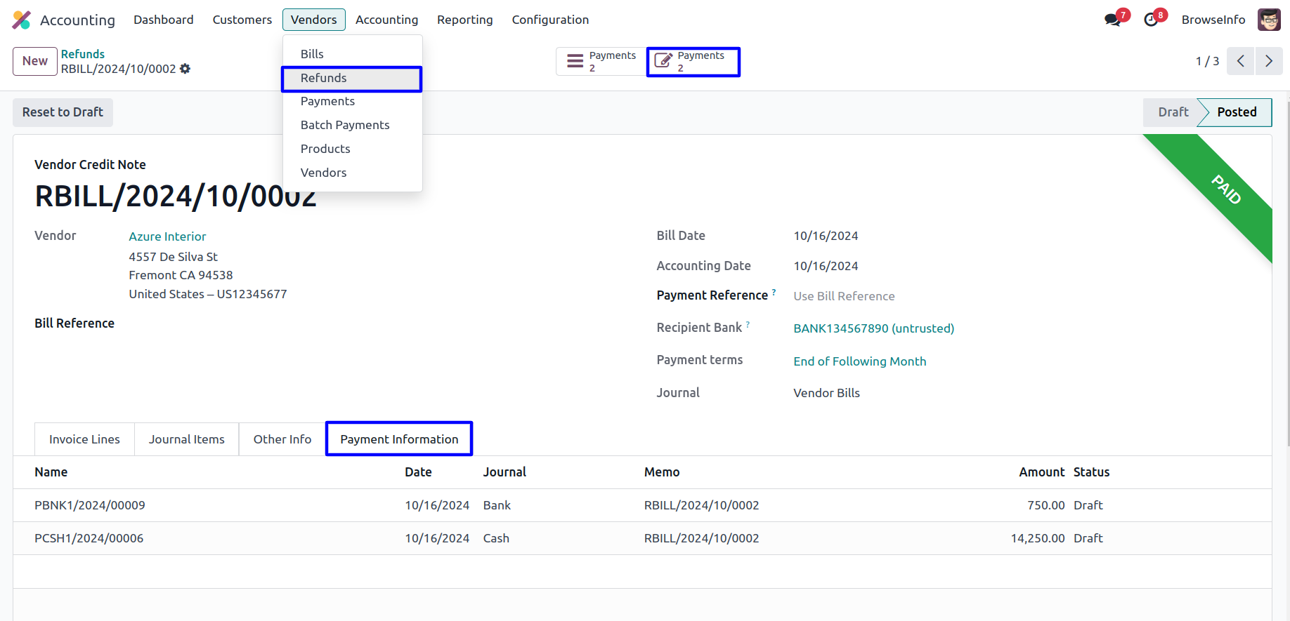User can see refund (vendor credit note) payment details and print on PDF report.