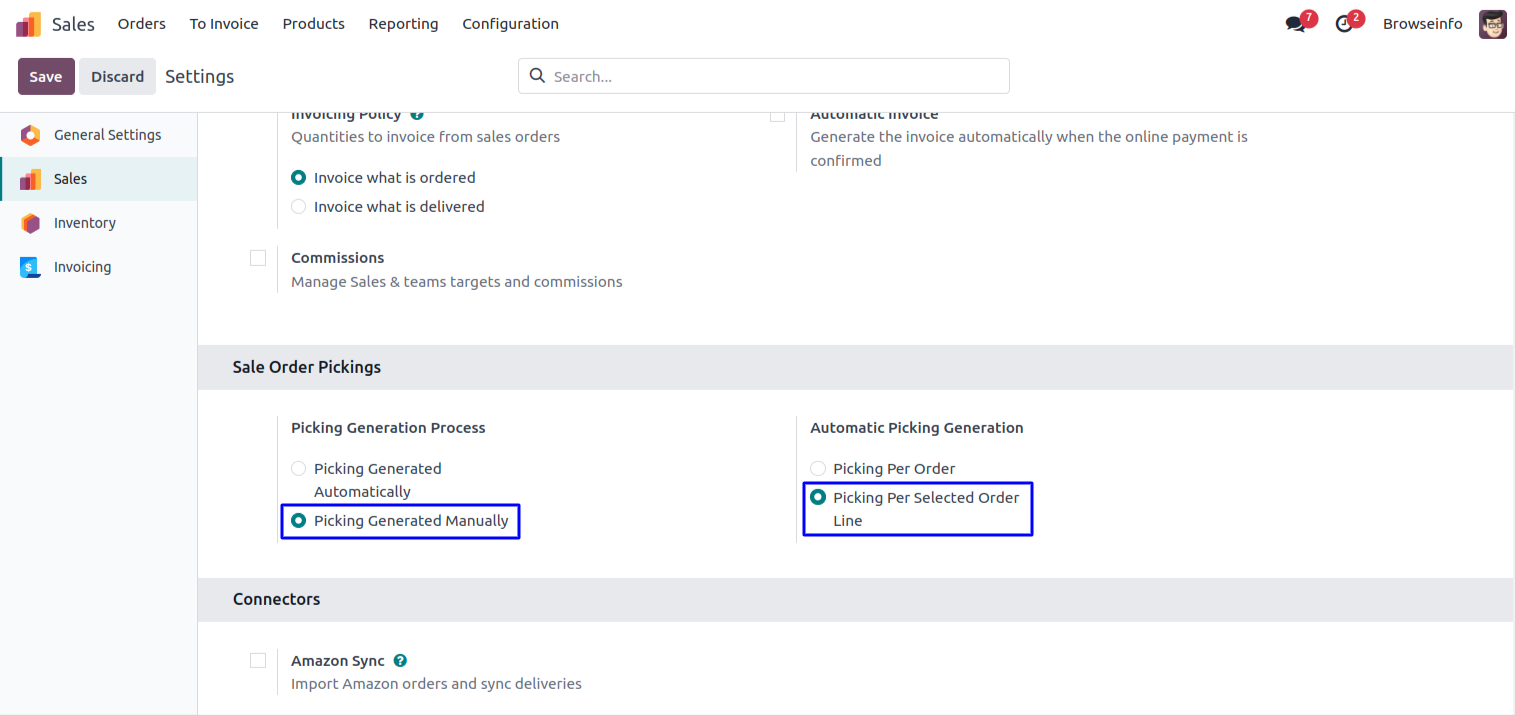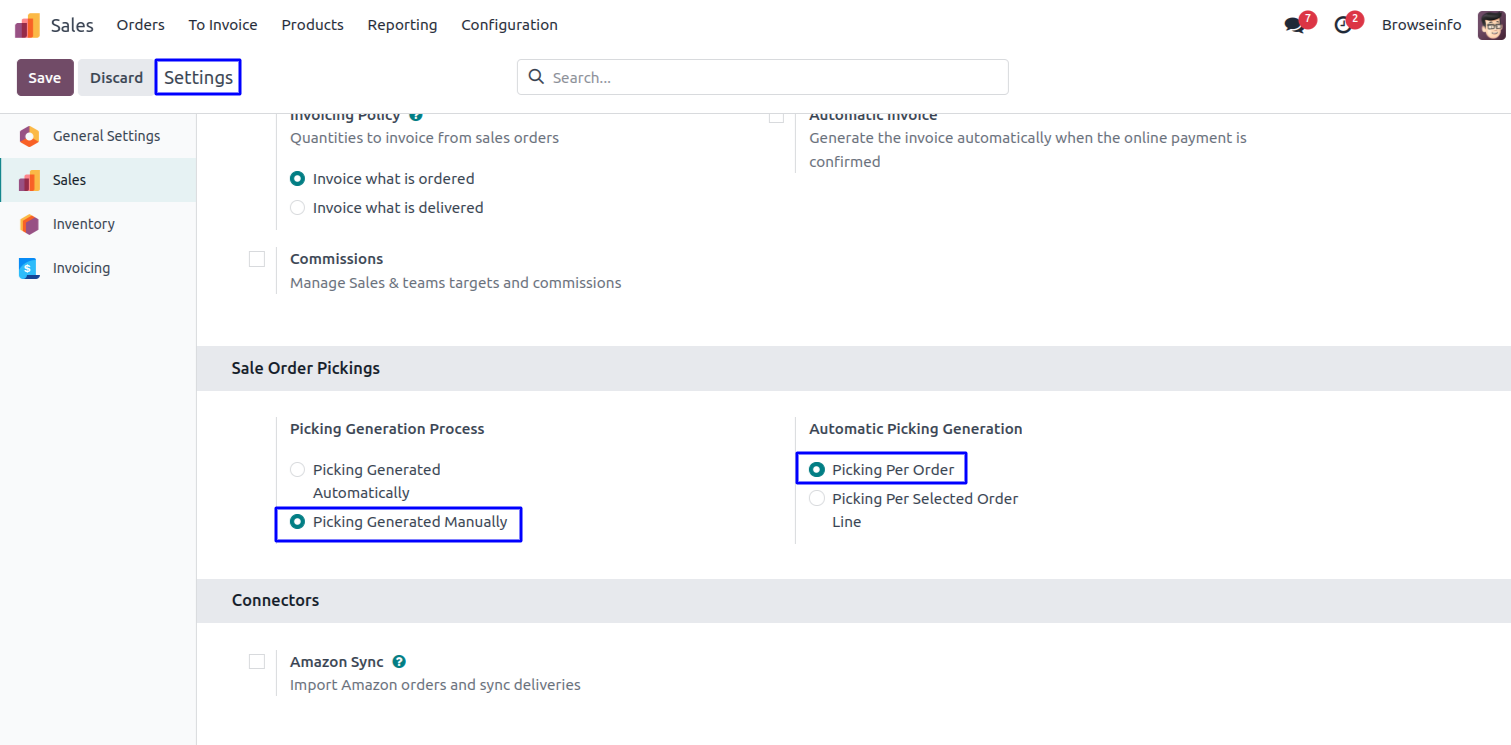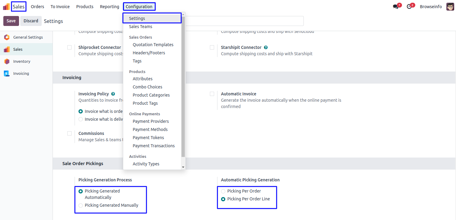 If user selects the "Picking Generated Manually" option then user needs to create a picking order manually after confirming the order, If user selects the "Picking Per Order" option then, the picking order is generated per sale order.