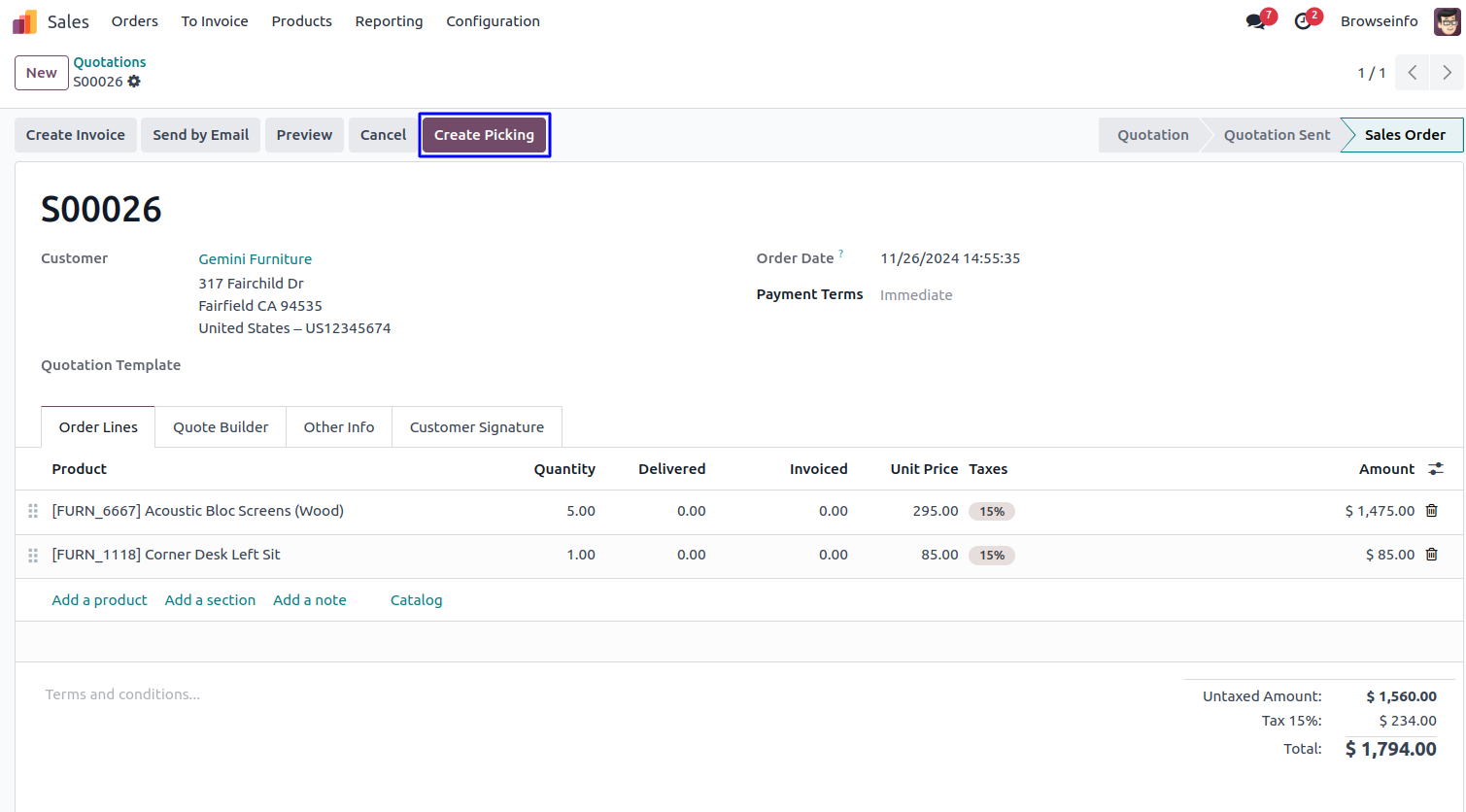 Under Sales > Configuration > Setting menu users have the option to select the picking generation process and automatic picking generation option. If the user selects the "Picking Generated Automatically" option then the picking order will automatically be generated upon confirming the order, If the user selects the "Picking Per Order" option then single picking order generated for the sale order, If the user selects "Picking Per Order Line" option then, picking order generated per sale order line.