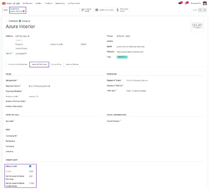 User can check or uncheck 'Allow Credit' checkbox for particular customer under Sales & Purchase tab and also set amount to raise warning and set amount to block credit order.