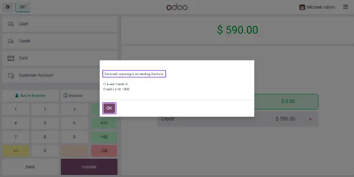 POS - Point of Sale Credit Limit Odoo App helps users to apply customer base credit limit on pos order, and able to use assigned credit amount as payment on pos using credit journal. In order to create a credit journal, users can tick the "Is Credit Journal" checkbox on journal view. Users can tick on allow credit checkbox for particular customer and also set amount to raise warning and block credit order. Display warning message. If order amount is exceeding warning limit than also you can validate order and if order amount is exceeding blocking limit than you cannot validate order. Users can see a warning message when a customer is not set, not sufficient credit for payment as well as when payment amount is exceeded.