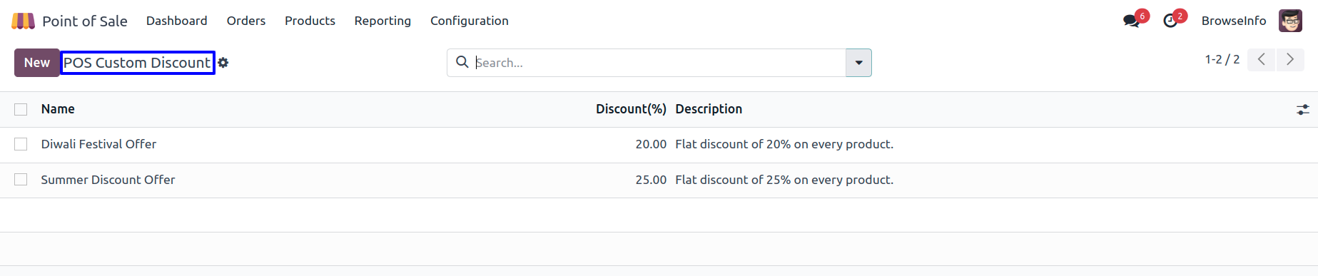 In POS Configuration, under Custom Discount tick the Allow Custom discount checkbox if you want to include custom discounts in POS. Add the Discounts which you want to include for a particular POS