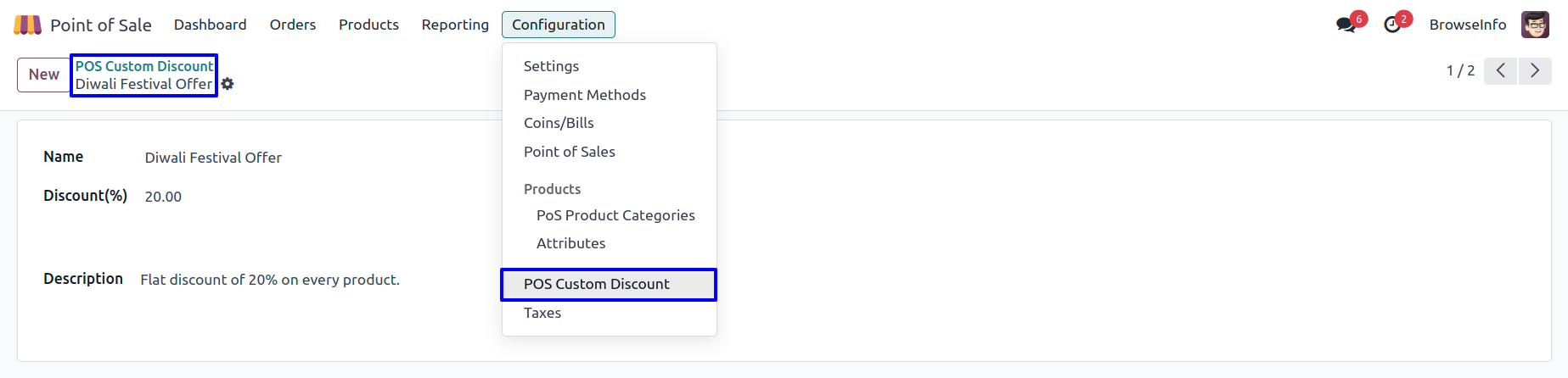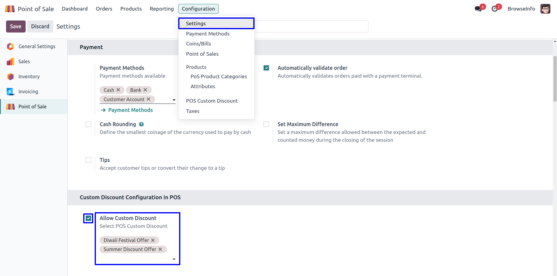 Under Configuration menu, create or edit the Custom Discount with Discount Name, Discount, and Available POS.