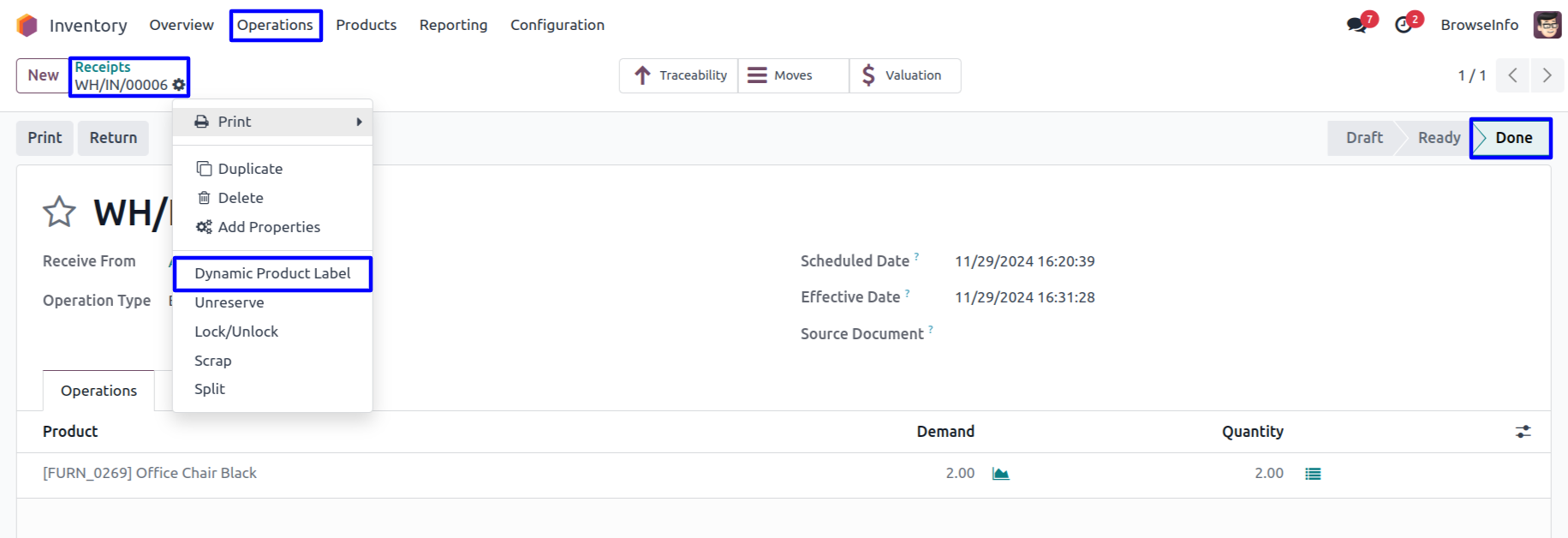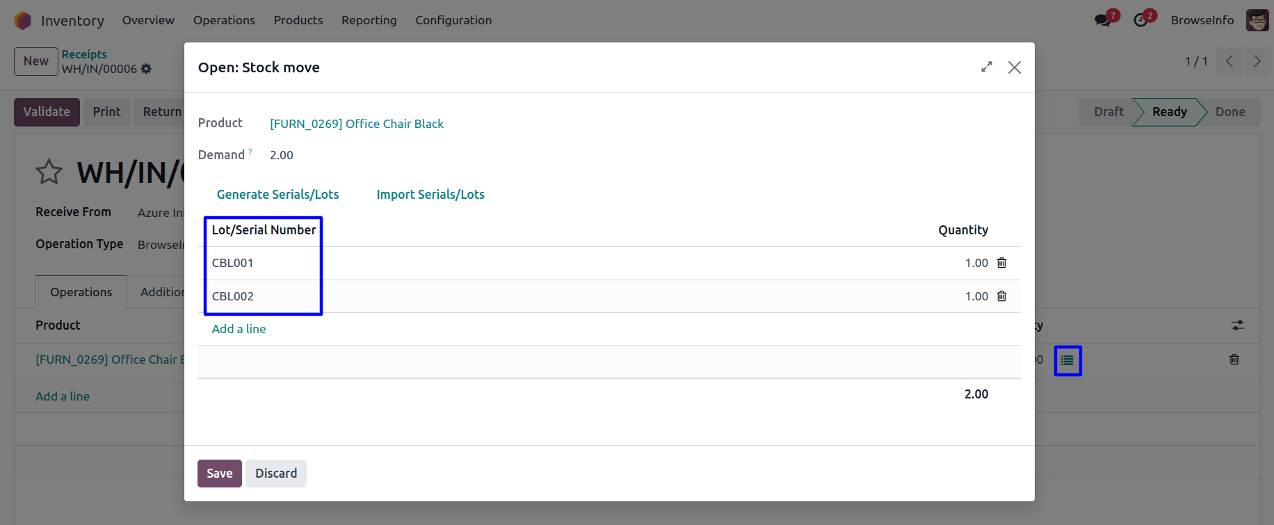 This Odoo apps helps to print product serial number label from stock picking either its stock receipt(incoming shipment) or delivery order. This Odoo modules prints same quantity number of serial number or lot number label as order quantity or stock picking quantity.