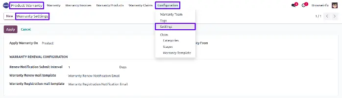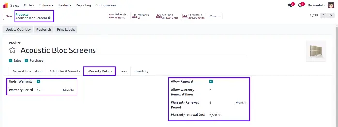Configure the Product with Under Warranty Checkbox. Configure Allow Renewal Checkbox if you allow renewal of the warranty for the product.