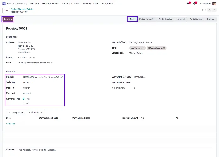 In this form Register Warranty with Customer, Product and Serial No. Choose Warranty Type Free for free Warranty. After Registration Click Confirm to Activate the Warranty