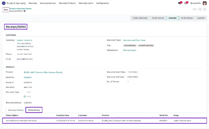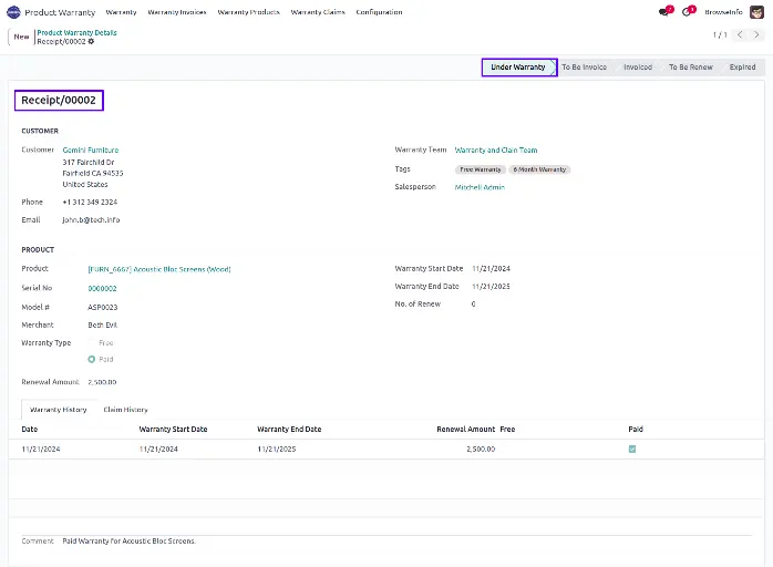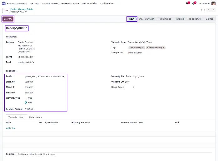 After Confirming the warranty will move to "Under Warranty" Stage and history will be created.