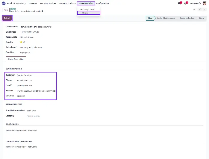 In this form Claim can be raised for a particular Product Serial No. Click Submit to Activate the Claim