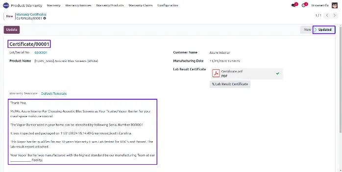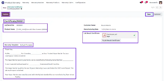 You can create warranty certificate by selection of product and it's lot/serial number also select template for creating certificate and update it.
