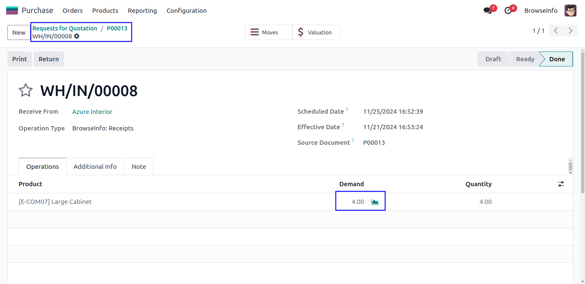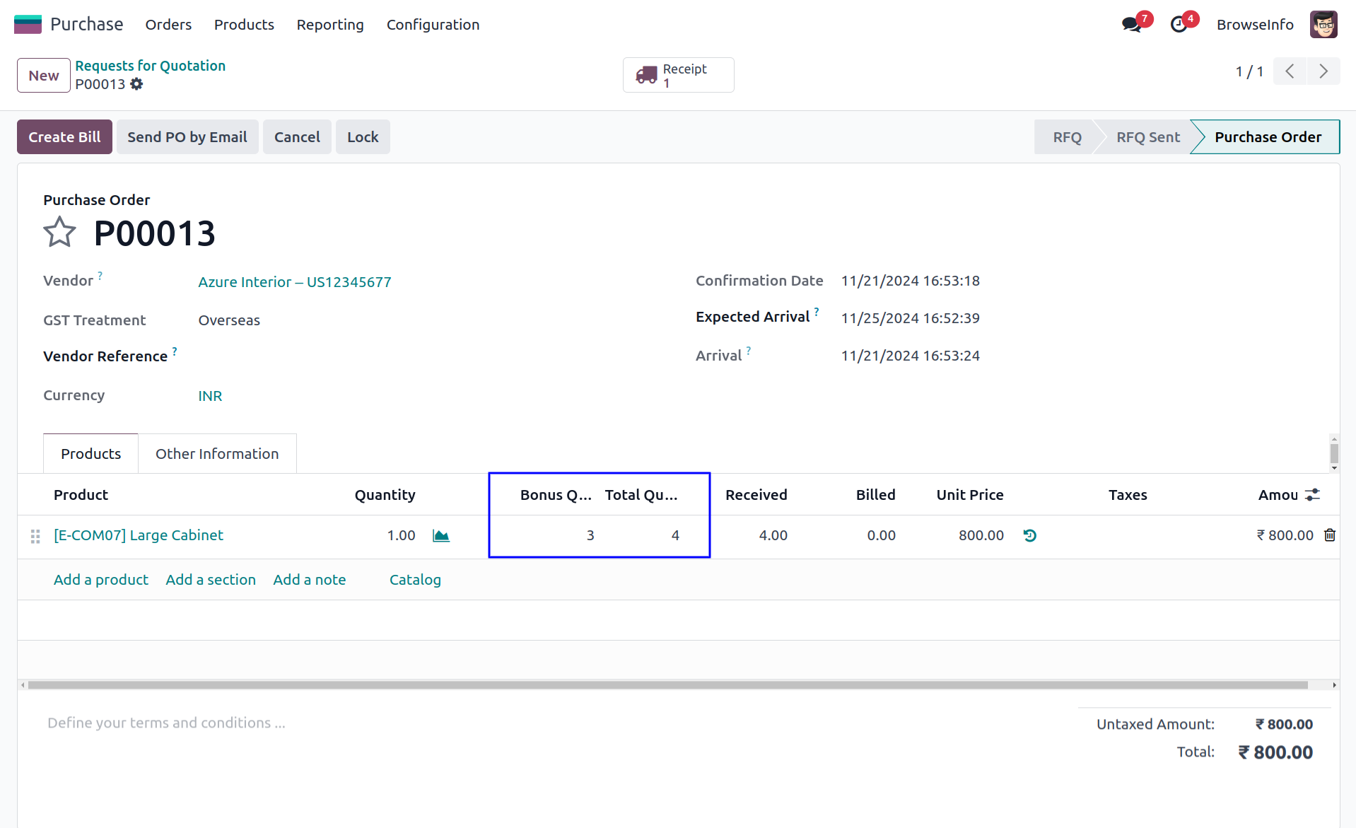 User can see purchase receipt will be created for both bonus and demanded quantities.