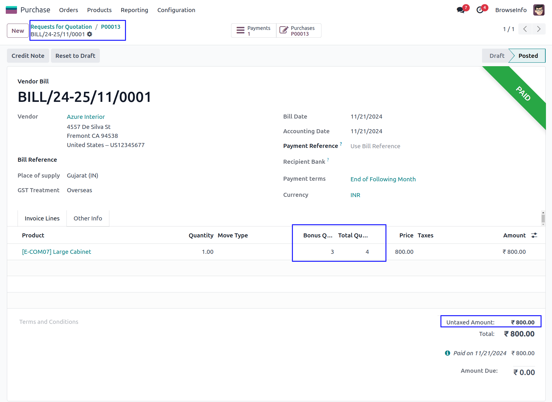 User can add "Bonus Quantity" in the purchase order and can see "Total Quantity", the price for bonus quantity will not add to total amount.