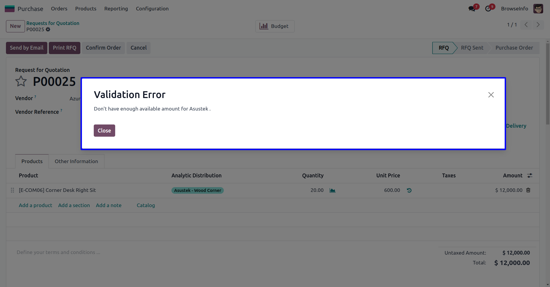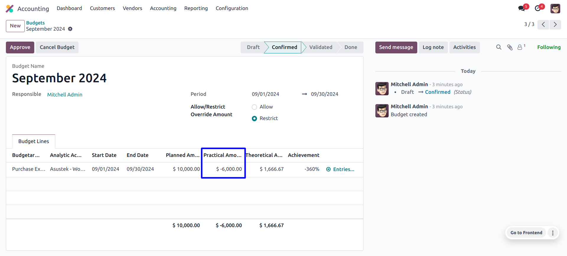 If the override amount is "Restrict" and the user tries to confirm a purchase order or vendor bill with a large amount compared to the budget amount then it will raise a warning.