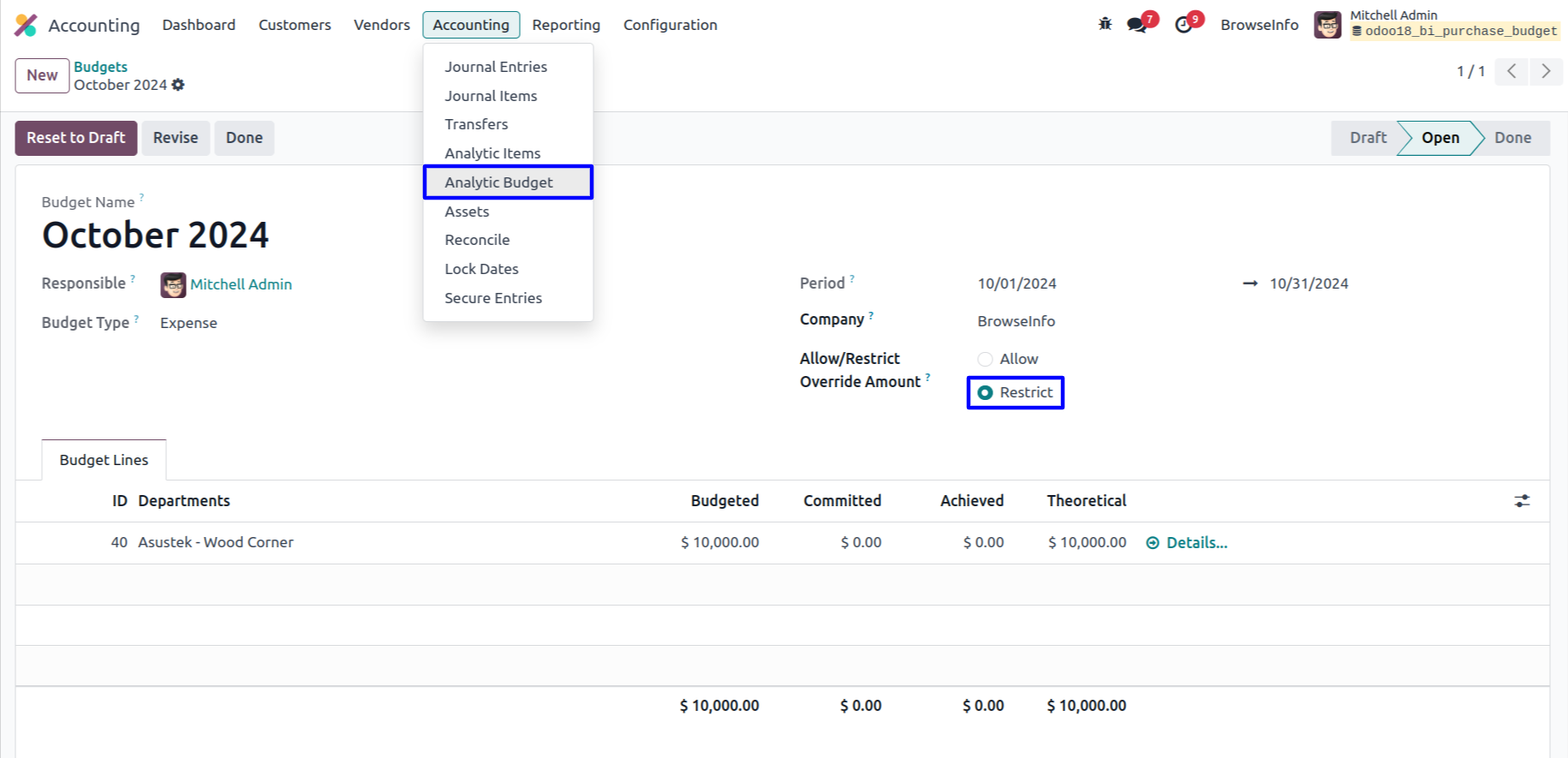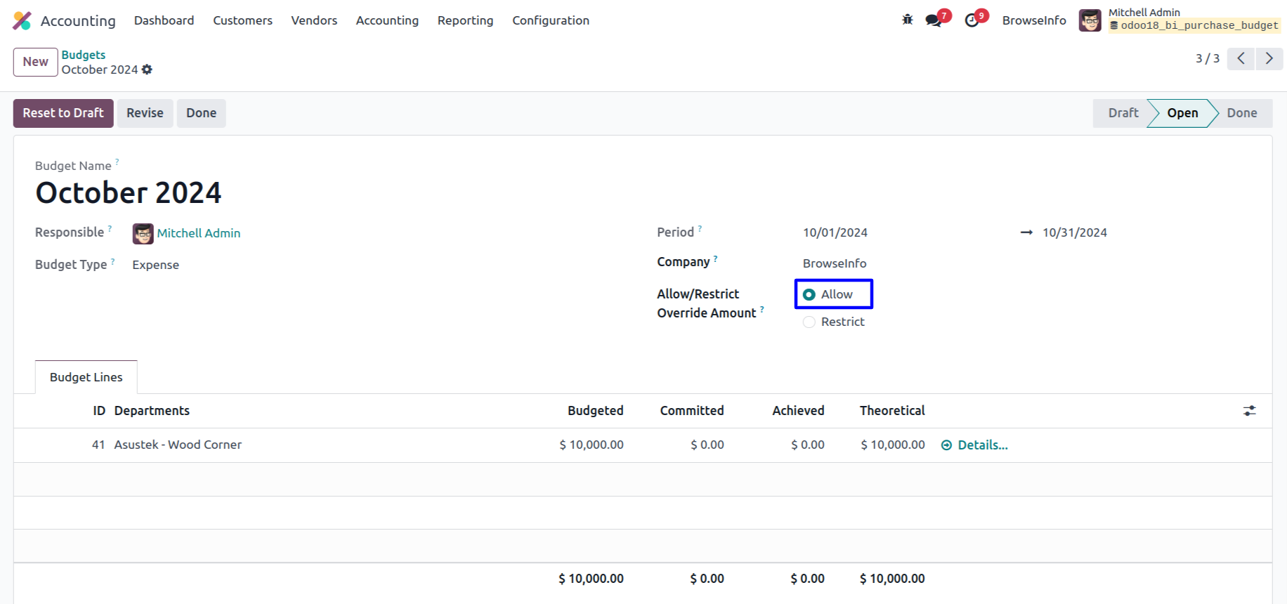 Users can create a budget under Invoicing > Accounting > Budgets menu, User can allow or restrict override budget amount.