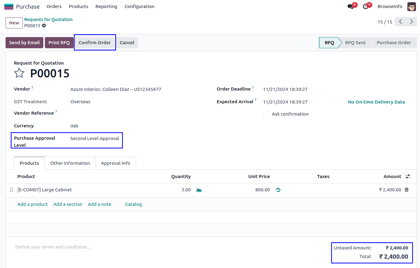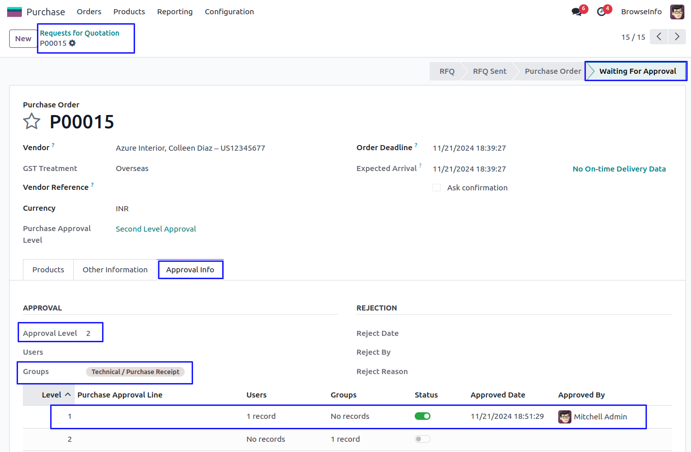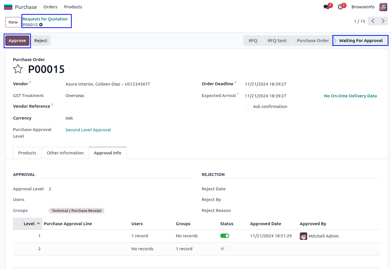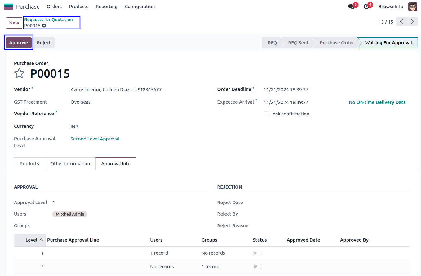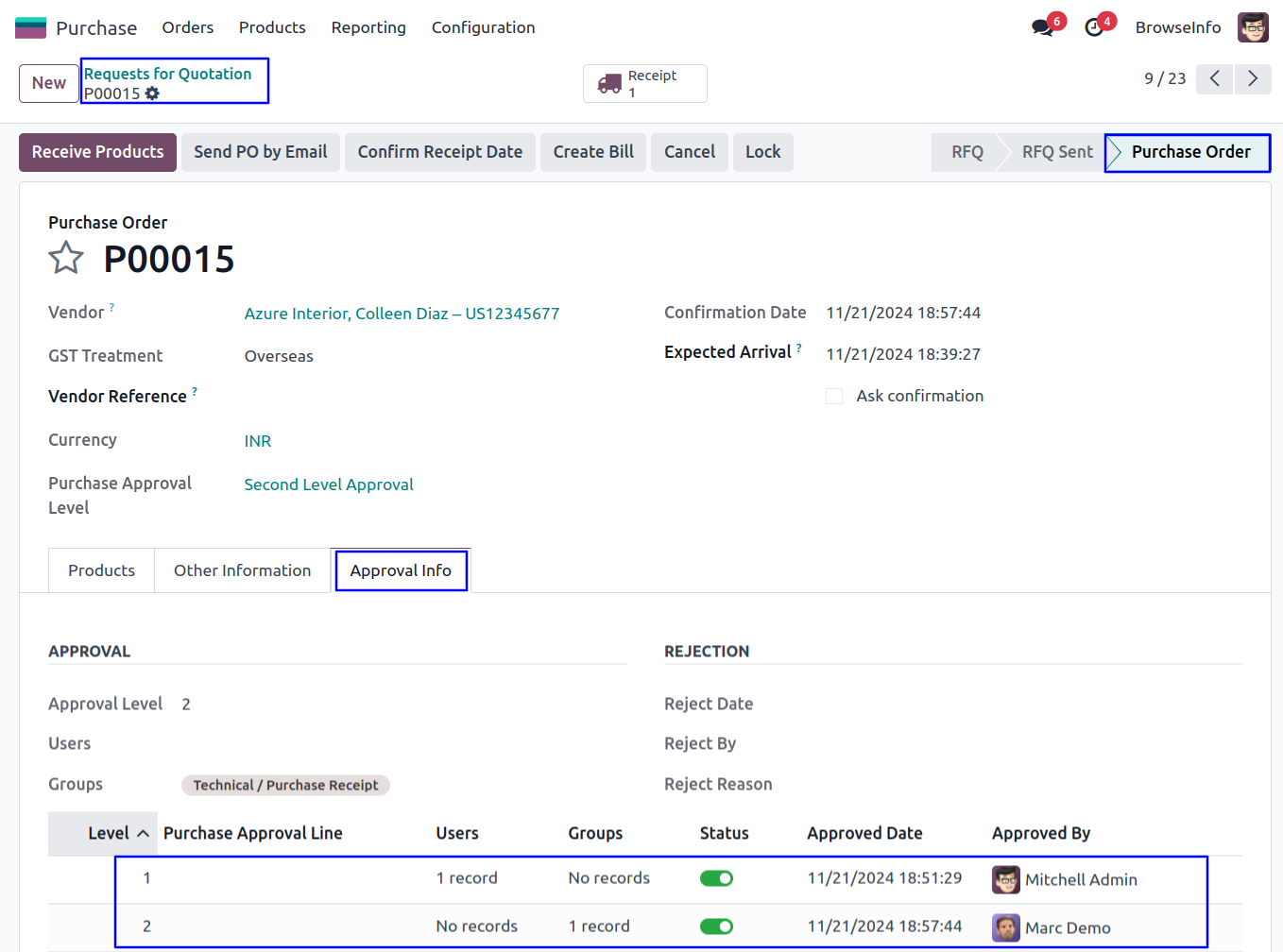 Once approved RFQ by second approver, Confirmed purchase order and view the details of approvers under 'Approval Info' tab.
