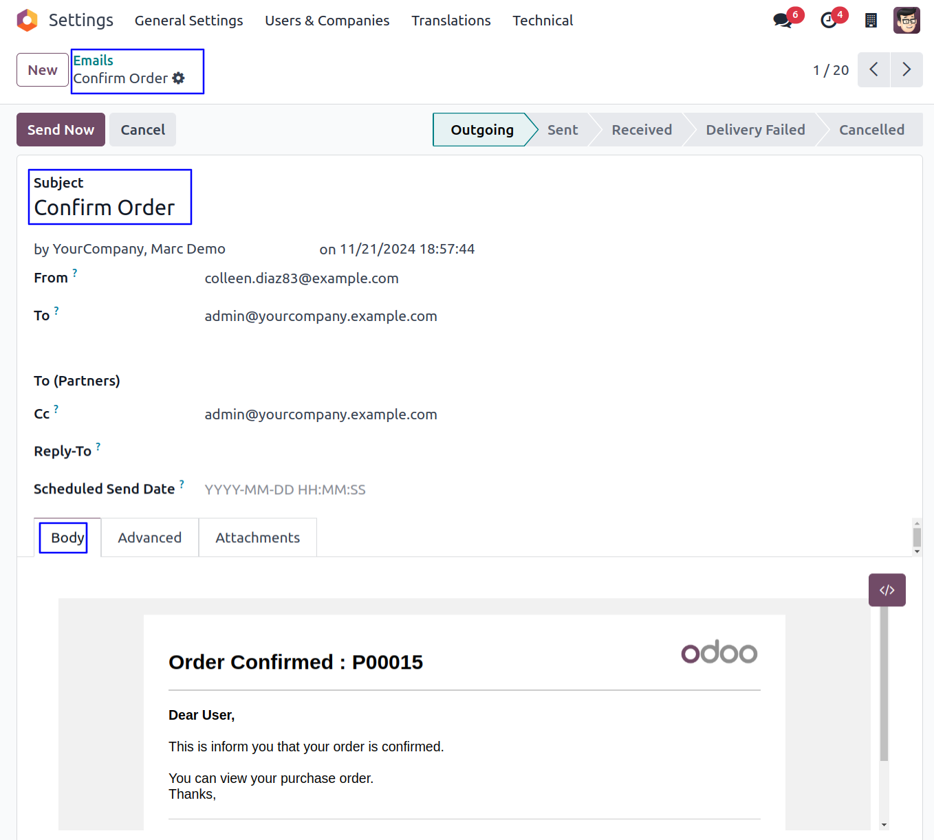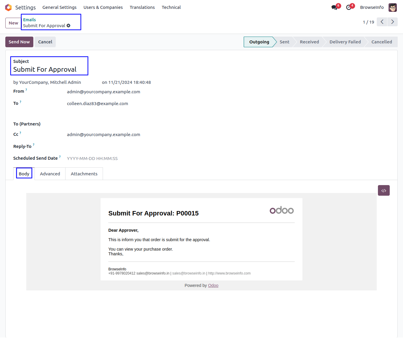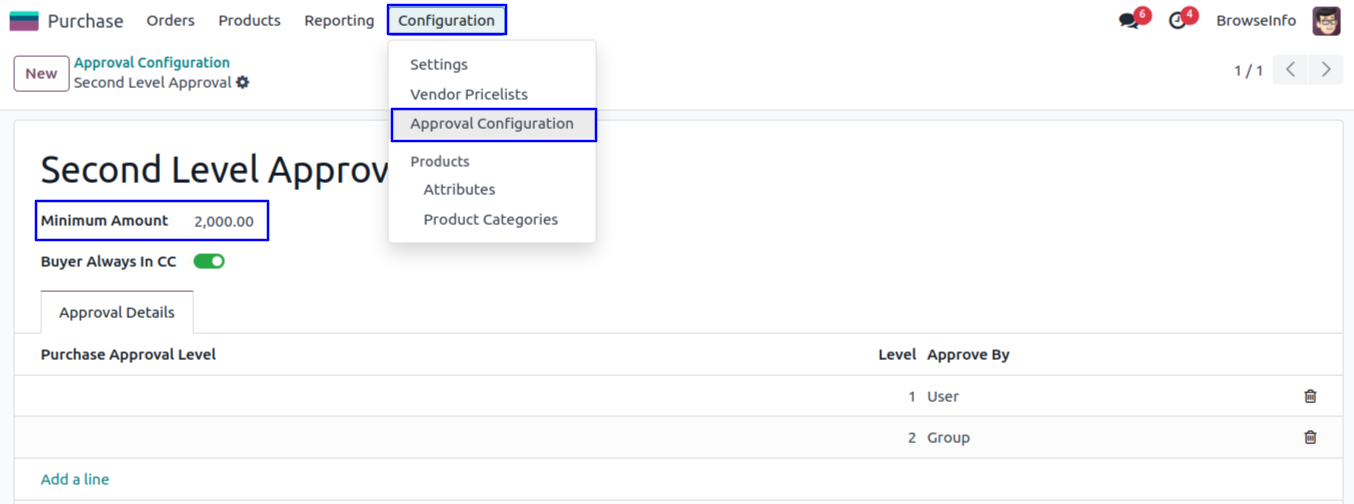 Goto Purchase -> Configuration -> Approval Configuration menu in that create purchase approval with minimum amount, Option to enable/disable 'Buyer Always in CC' and enter approval details.