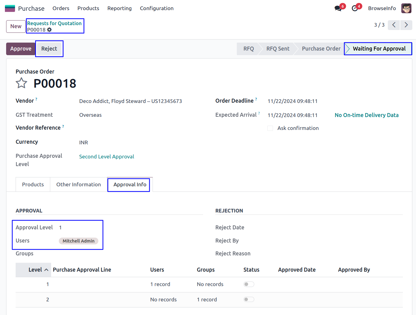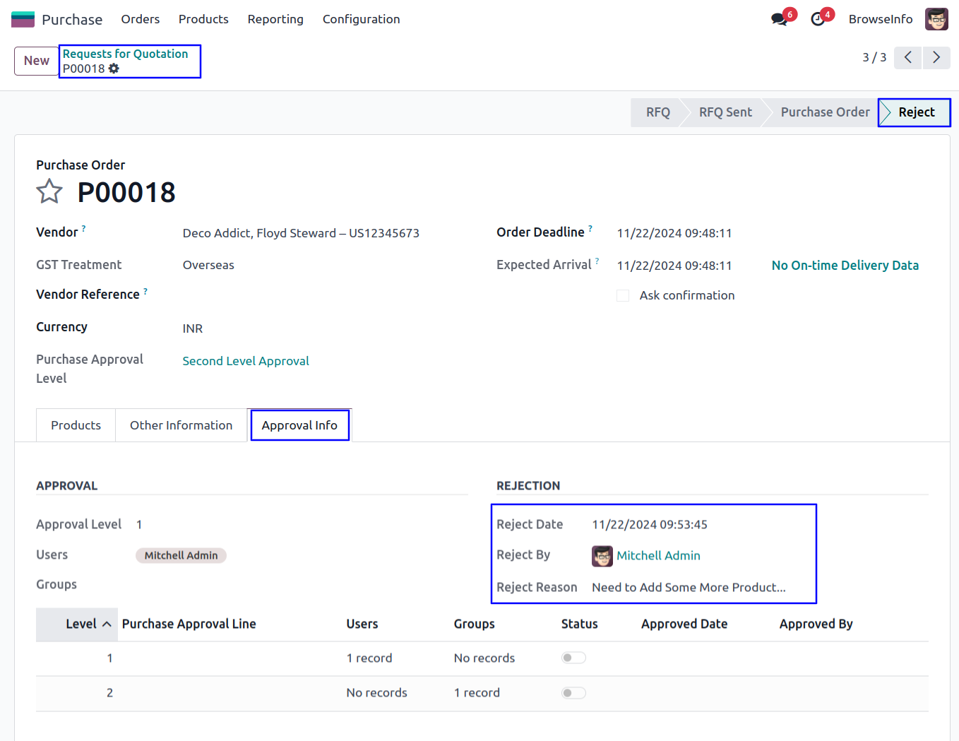 After rejected RFQ by approver, Request for quotation moved to 'Reject' stage and no more approvals needed. User can view rejection information under 'Approval Info' tab.