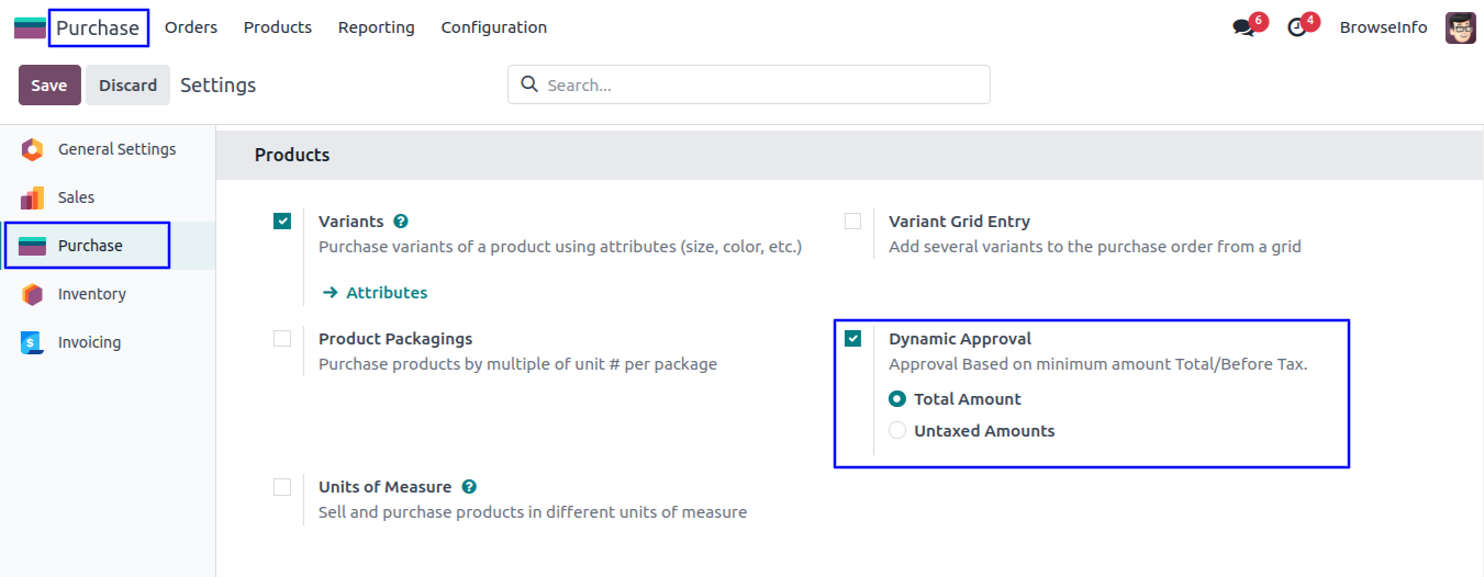 User can configure purchase dynamic approvals and set based on 'Total Amount' and 'Untaxed Amount'.