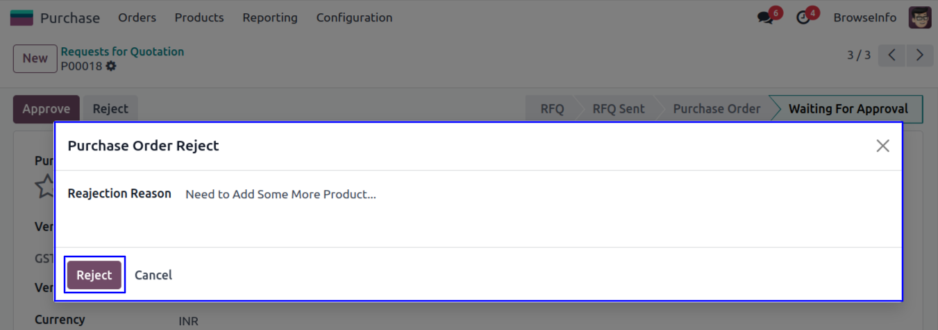 Once click on 'Reject' button, Approver must be enter rejection reason in this wizard.