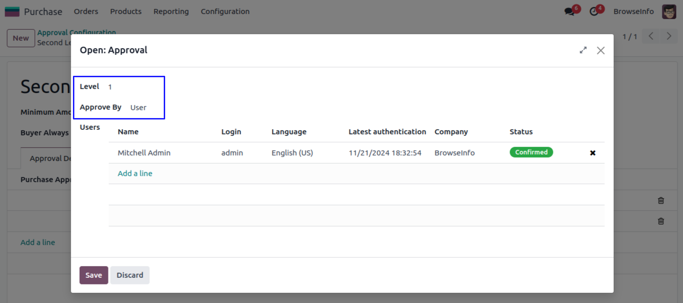 There are two types of approval process 1) User and 2) Group, Here select approval process by 'User' and define person who approved the purchase.