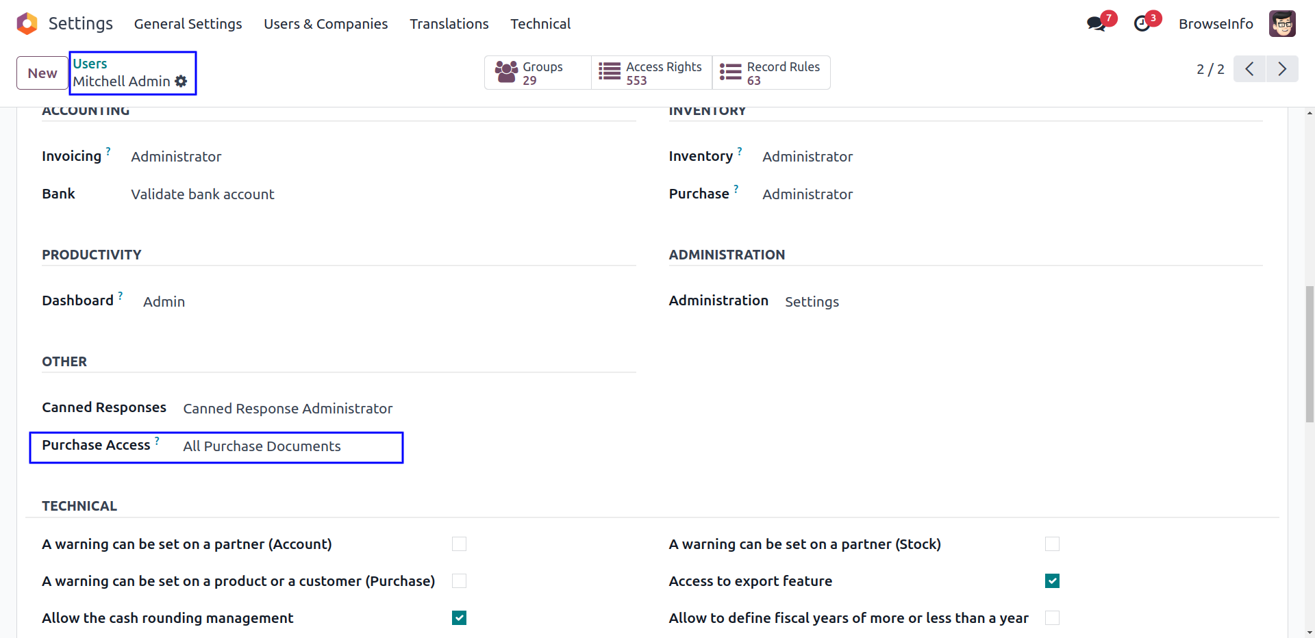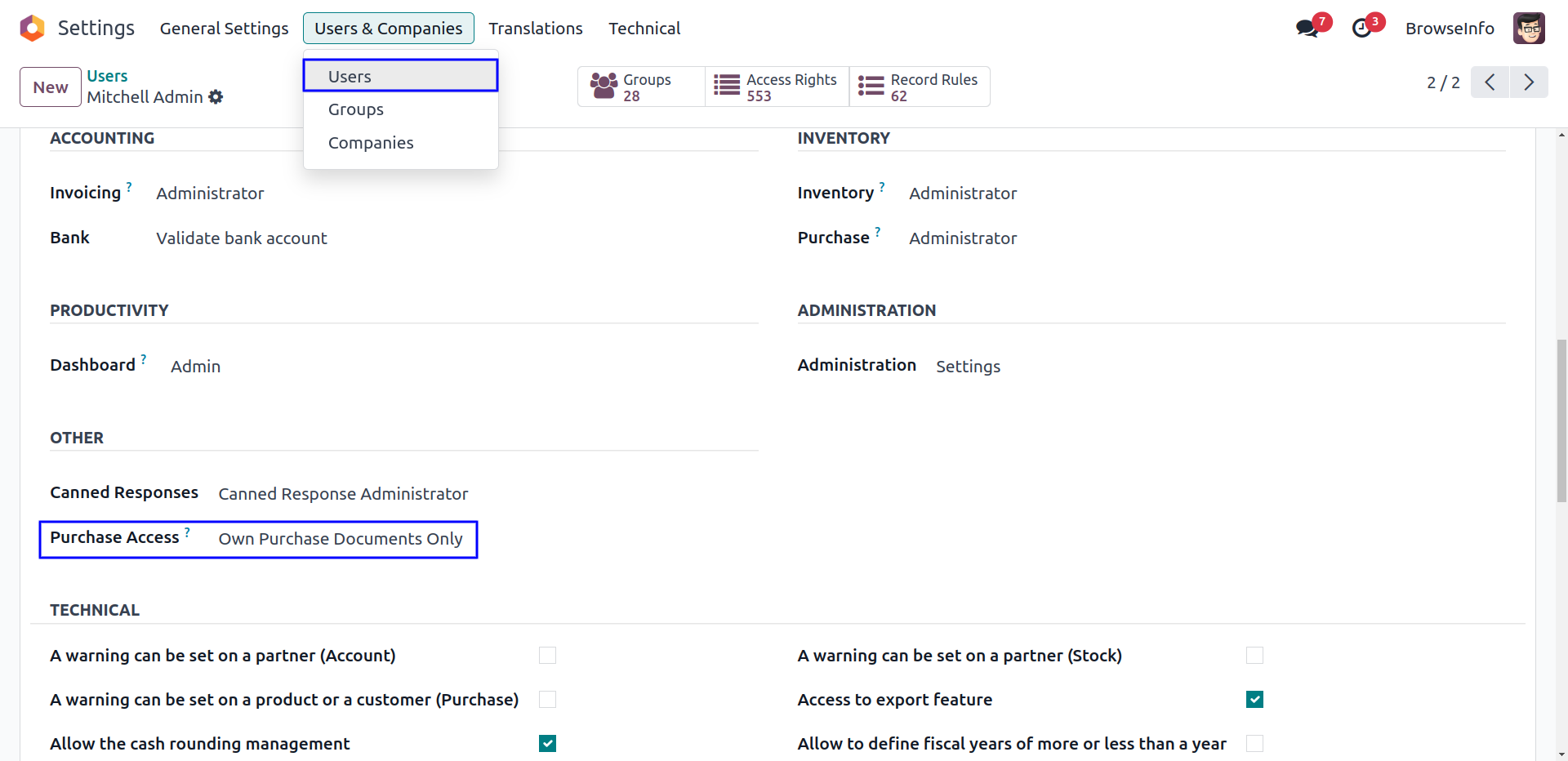 When in user "Own Purchase Documents Only" selected, it will only shows the PO/RFQ of employee's own.