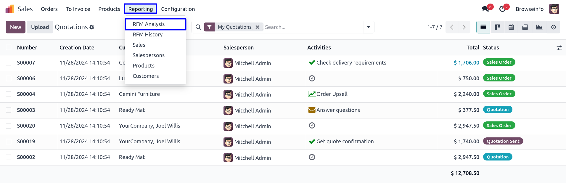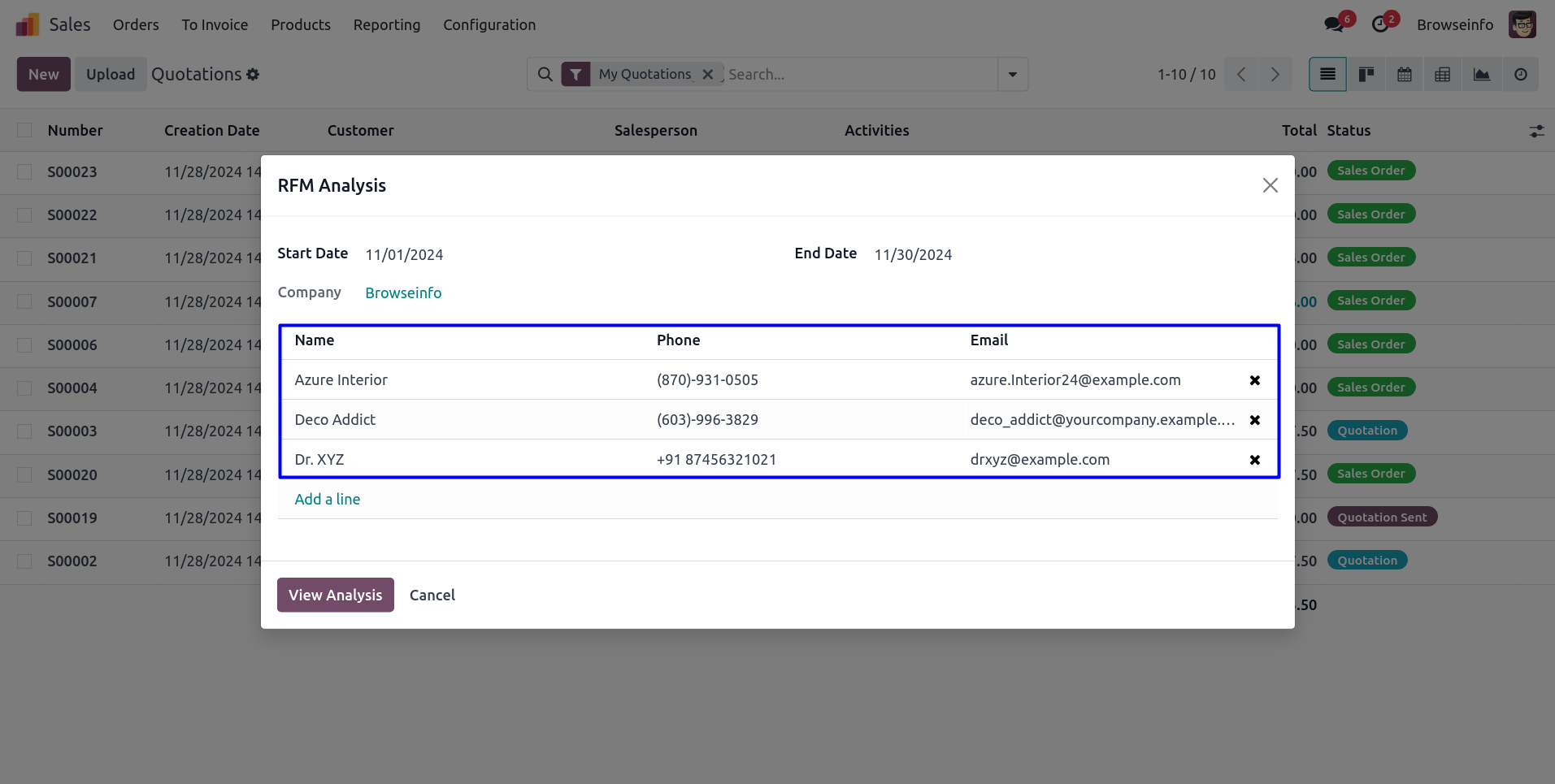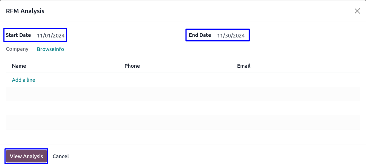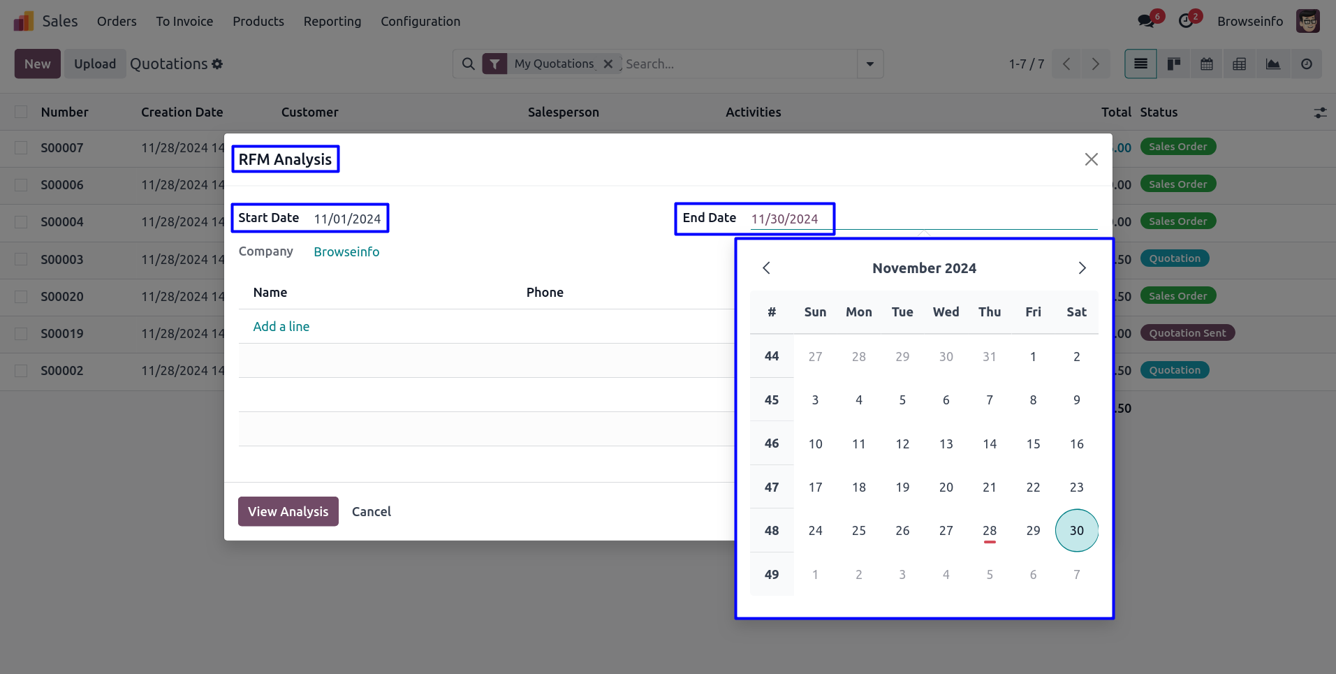 Goto Sales -> Reporting -> RFM Analysis menu, When user click on 'RFM Analysis' menu one wizard will be open.