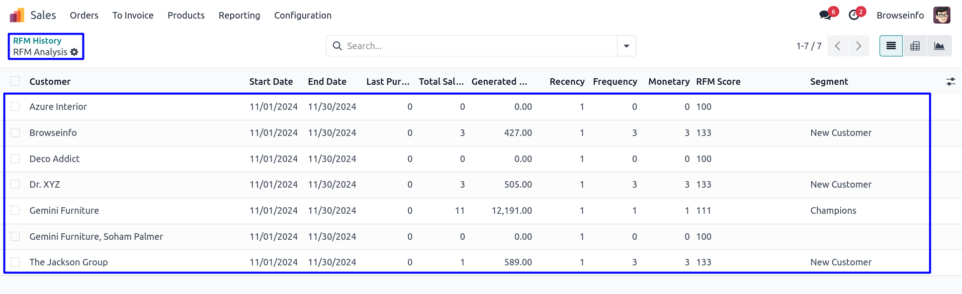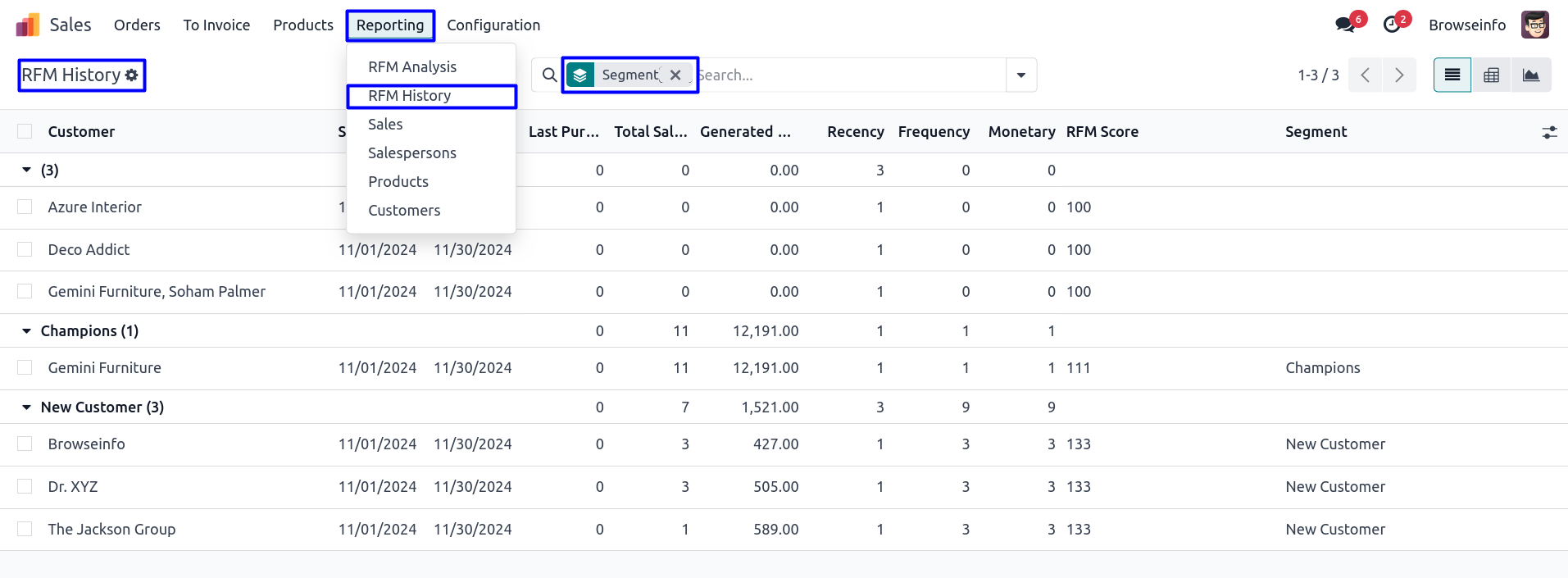 Goto Sales -> Reporting -> RFM History menu, User can see RFM history with group by customer according to segment.