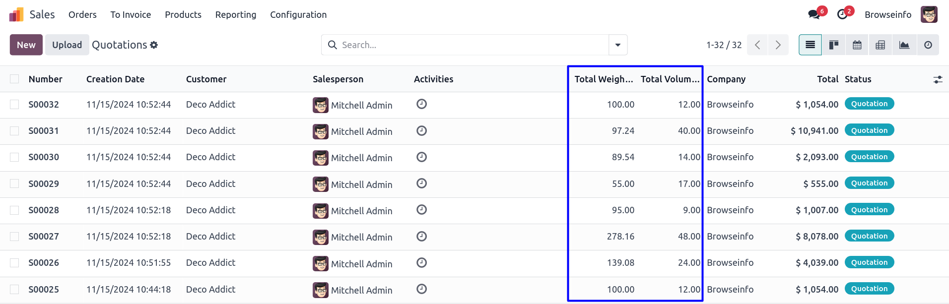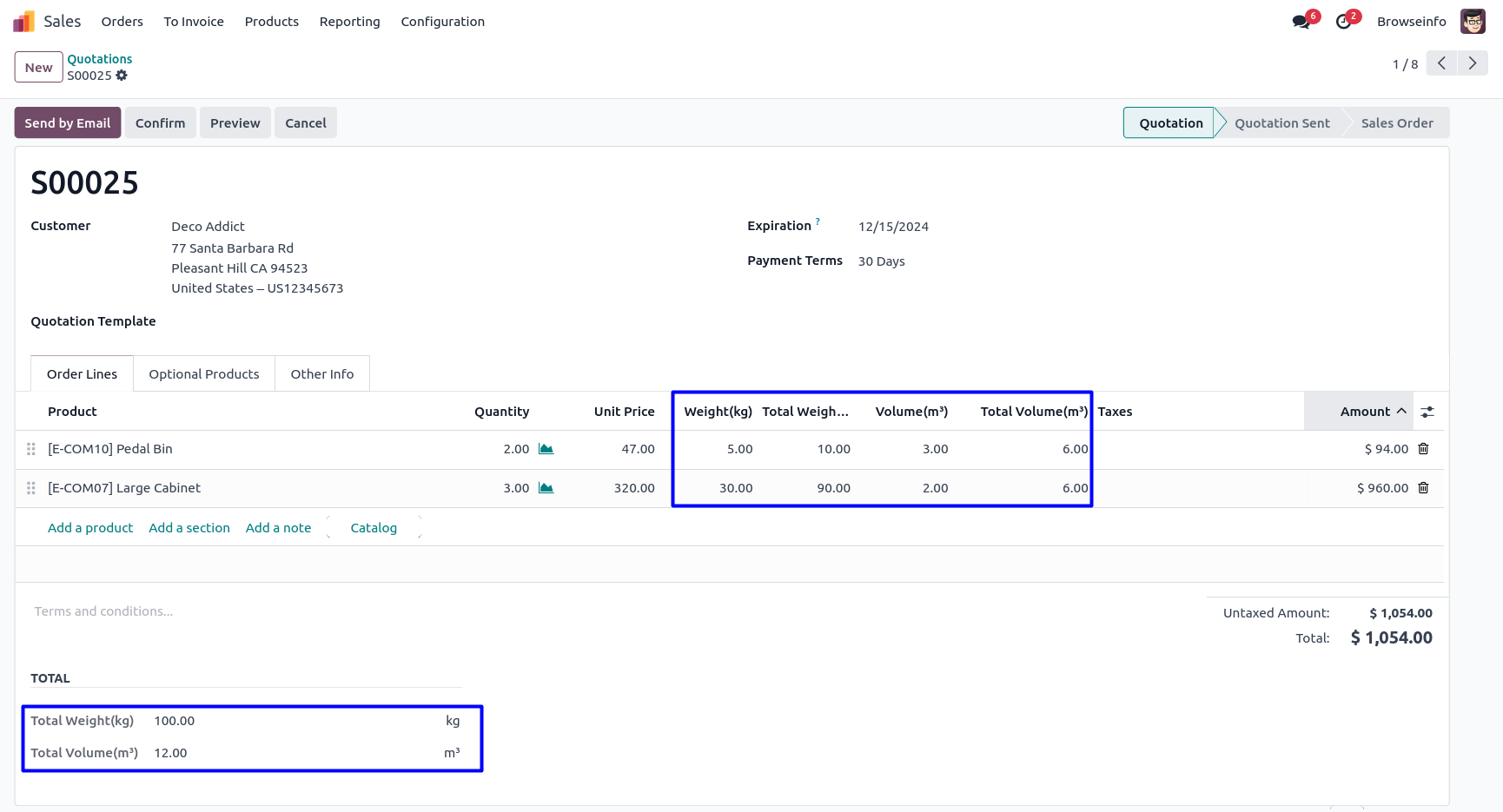 Product Total Weight and Total Volume of Sale Quotations